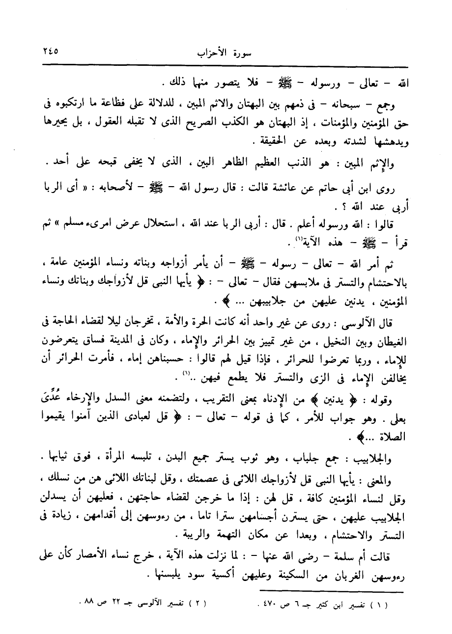 ثم أمر الله- تعالى- رسوله صلّى الله عليه وسلّم أن يأمر أزواجه وبناته ونساء المؤمنين عامة، بالاحتشام والتستر في ملابسهن فقال- تعالى-: يا أَيُّهَا النَّبِيُّ قُلْ لِأَزْواجِكَ وَبَناتِكَ وَنِساءِ الْمُؤْمِنِينَ، يُدْنِينَ عَلَيْهِنَّ مِنْ جَلَابِيبِهِنَّ....