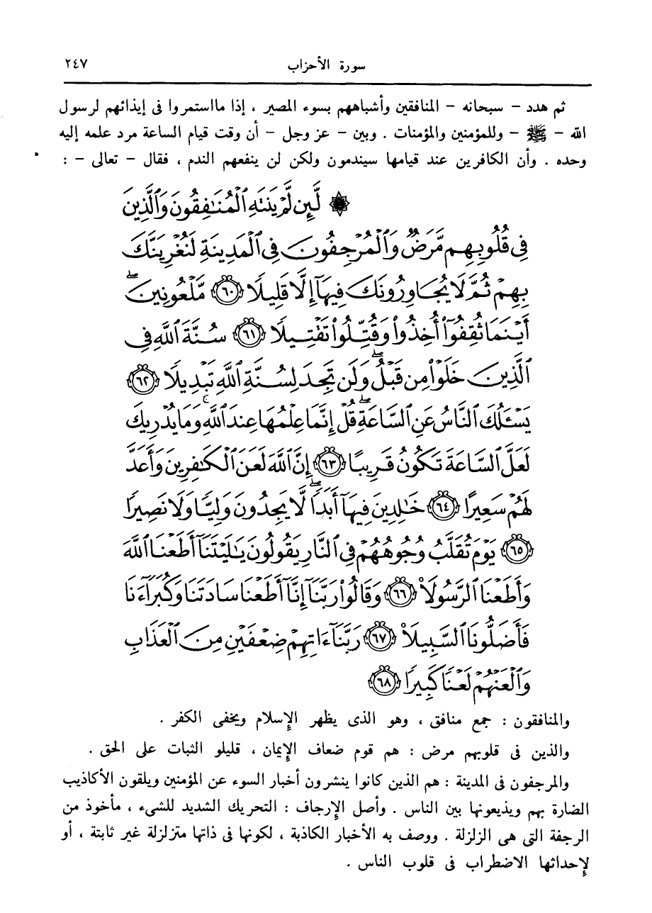 لَئِنْ لَمْ يَنْتَهِ الْمُنافِقُونَ وَالَّذِينَ فِي قُلُوبِهِمْ مَرَضٌ وَالْمُرْجِفُونَ فِي الْمَدِينَةِ لَنُغْرِيَنَّكَ بِهِمْ ثُمَّ لا يُجاوِرُونَكَ فِيها إِلاَّ قَلِيلاً (60) مَلْعُونِينَ أَيْنَما ثُقِفُوا أُخِذُوا وَقُتِّلُوا تَقْتِيلاً (61) سُنَّةَ اللَّهِ فِي الَّذِينَ خَلَوْا مِنْ قَبْلُ وَلَنْ تَجِدَ لِسُنَّةِ اللَّهِ تَبْدِيلاً (62) يَسْئَلُكَ النَّاسُ عَنِ السَّاعَةِ قُلْ إِنَّما عِلْمُها عِنْدَ اللَّهِ وَما يُدْرِيكَ لَعَلَّ السَّاعَةَ تَكُونُ قَرِيباً (63) إِنَّ اللَّهَ لَعَنَ الْكافِرِينَ وَأَعَدَّ لَهُمْ سَعِيراً (64)