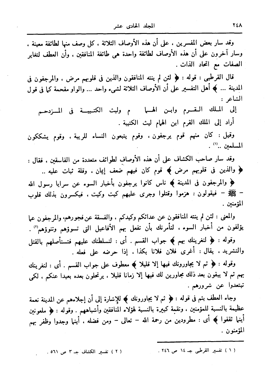 قال القرطبي: قوله: لَئِنْ لَمْ يَنْتَهِ الْمُنافِقُونَ وَالَّذِينَ فِي قُلُوبِهِمْ مَرَضٌ، وَالْمُرْجِفُونَ فِي الْمَدِينَةِ ... أهل التفسير على أن الأوصاف الثلاثة لشيء واحد ... والواو مقحمة كما في قول الشاعر: