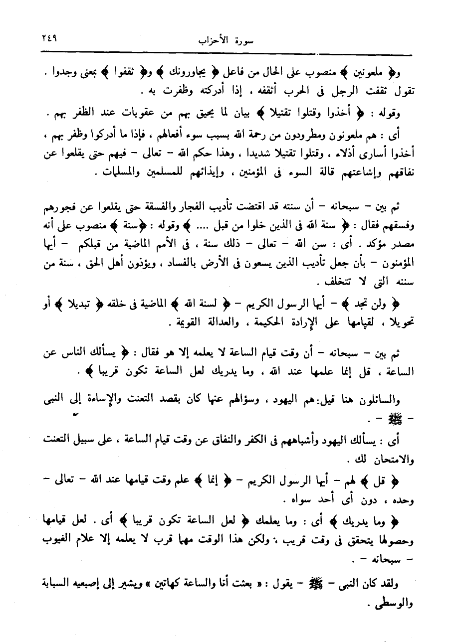 ثم بين- سبحانه- أن سنته قد اقتضت تأديب الفجار والفسقة حتى يقلعوا عن فجورهم وفسقهم فقال: سُنَّةَ اللَّهِ فِي الَّذِينَ خَلَوْا مِنْ قَبْلُ ... وقوله: لِسُنَّةِ منصوب على أنه مصدر مؤكد. أى: سن الله- تعالى- ذلك سنة، في الأمم الماضية من قبلكم- أيها المؤمنون- بأن جعل تأديب الذين يسعون في الأرض بالفساد، ويؤذون أهل الحق، سنة من سننه التي لا تتخلف.