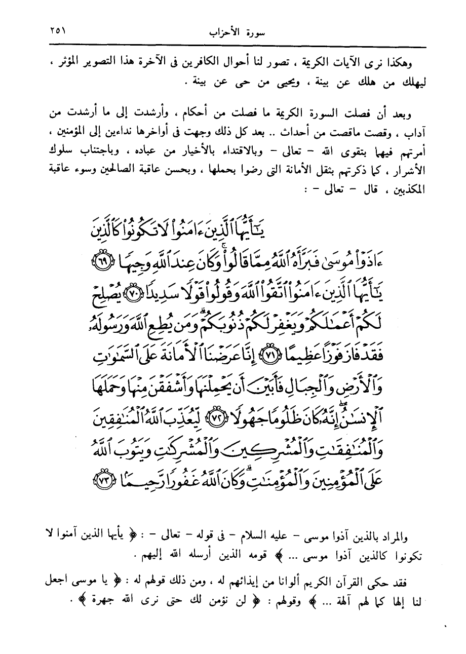 يا أَيُّهَا الَّذِينَ آمَنُوا لا تَكُونُوا كَالَّذِينَ آذَوْا مُوسى فَبَرَّأَهُ اللَّهُ مِمَّا قالُوا وَكانَ عِنْدَ اللَّهِ وَجِيهاً (69) يا أَيُّهَا الَّذِينَ آمَنُوا اتَّقُوا اللَّهَ وَقُولُوا قَوْلاً سَدِيداً (70) يُصْلِحْ لَكُمْ أَعْمالَكُمْ وَيَغْفِرْ لَكُمْ ذُنُوبَكُمْ وَمَنْ يُطِعِ اللَّهَ وَرَسُولَهُ فَقَدْ فازَ فَوْزاً عَظِيماً (71) إِنَّا عَرَضْنَا الْأَمانَةَ عَلَى السَّماواتِ وَالْأَرْضِ وَالْجِبالِ فَأَبَيْنَ أَنْ يَحْمِلْنَها وَأَشْفَقْنَ مِنْها وَحَمَلَهَا الْإِنْسانُ إِنَّهُ كانَ ظَلُوماً جَهُولاً (72) لِيُعَذِّبَ اللَّهُ الْمُنافِقِينَ وَالْمُنافِقاتِ وَالْمُشْرِكِينَ وَالْمُشْرِكاتِ وَيَتُوبَ اللَّهُ عَلَى الْمُؤْمِنِينَ وَالْمُؤْمِناتِ وَكانَ اللَّهُ غَفُوراً رَحِيماً (73)