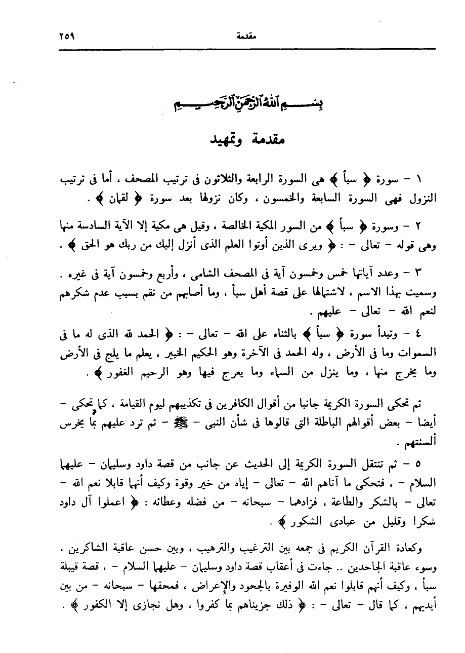 5- ثم تنتقل السورة الكريمة إلى الحديث عن جانب من قصة داود وسليمان- عليهما السلام-، فتحكى ما آتاهم الله- تعالى- إياه من خير وقوة وكيف أنهما قابلا نعم الله- تعالى- بالشكر والطاعة، فزادهما- سبحانه- من فضله وعطائه: اعْمَلُوا آلَ داوُدَ شُكْراً وَقَلِيلٌ مِنْ عِبادِيَ الشَّكُورُ.