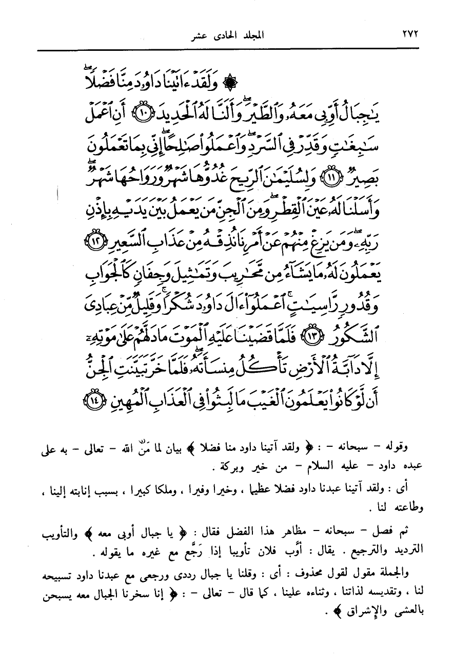 وَلَقَدْ آتَيْنا داوُدَ مِنَّا فَضْلاً يا جِبالُ أَوِّبِي مَعَهُ وَالطَّيْرَ وَأَلَنَّا لَهُ الْحَدِيدَ (10) أَنِ اعْمَلْ سابِغاتٍ وَقَدِّرْ فِي السَّرْدِ وَاعْمَلُوا صالِحاً إِنِّي بِما تَعْمَلُونَ بَصِيرٌ (11) وَلِسُلَيْمانَ الرِّيحَ غُدُوُّها شَهْرٌ وَرَواحُها شَهْرٌ وَأَسَلْنا لَهُ عَيْنَ الْقِطْرِ وَمِنَ الْجِنِّ مَنْ يَعْمَلُ بَيْنَ يَدَيْهِ بِإِذْنِ رَبِّهِ وَمَنْ يَزِغْ مِنْهُمْ عَنْ أَمْرِنا نُذِقْهُ مِنْ عَذابِ السَّعِيرِ (12) يَعْمَلُونَ لَهُ ما يَشاءُ مِنْ مَحارِيبَ وَتَماثِيلَ وَجِفانٍ كَالْجَوابِ وَقُدُورٍ راسِياتٍ اعْمَلُوا آلَ داوُدَ شُكْراً وَقَلِيلٌ مِنْ عِبادِيَ الشَّكُورُ (13) فَلَمَّا قَضَيْنا عَلَيْهِ الْمَوْتَ ما دَلَّهُمْ عَلى مَوْتِهِ إِلاَّ دَابَّةُ الْأَرْضِ تَأْكُلُ مِنْسَأَتَهُ فَلَمَّا خَرَّ تَبَيَّنَتِ الْجِنُّ أَنْ لَوْ كانُوا يَعْلَمُونَ الْغَيْبَ ما لَبِثُوا فِي الْعَذابِ الْمُهِينِ (14)