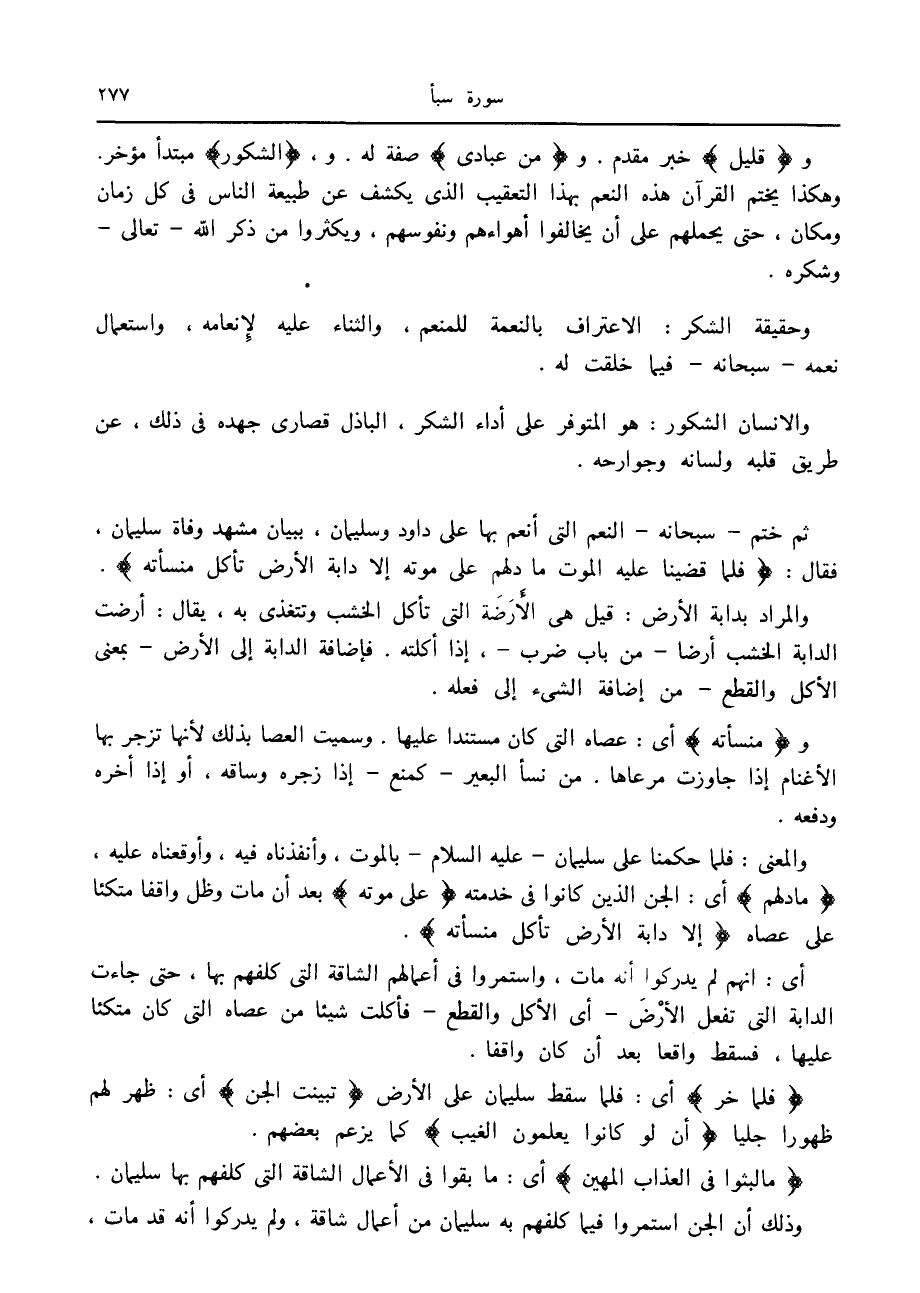 ثم ختم- سبحانه- النعم التي أنعم بها على داود وسليمان، ببيان مشهد وفاة سليمان، فقال: فَلَمَّا قَضَيْنا عَلَيْهِ الْمَوْتَ ما دَلَّهُمْ عَلى مَوْتِهِ إِلَّا دَابَّةُ الْأَرْضِ تَأْكُلُ مِنْسَأَتَهُ.