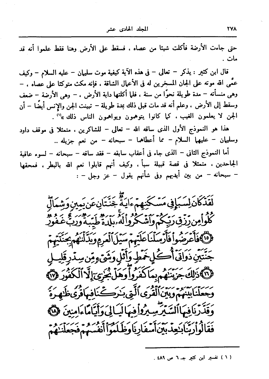 أما النموذج الثاني- الذي جاء في أعقاب سابقه- فقد ساقه- سبحانه- لسوء عاقبة الجاحدين، متمثلا في قصة قبيلة سبأ، وكيف أنهم قابلوا نعم الله بالبطر، فمحقها- سبحانه- من بين أيديهم وفي شأنهم يقول- عز وجل-: