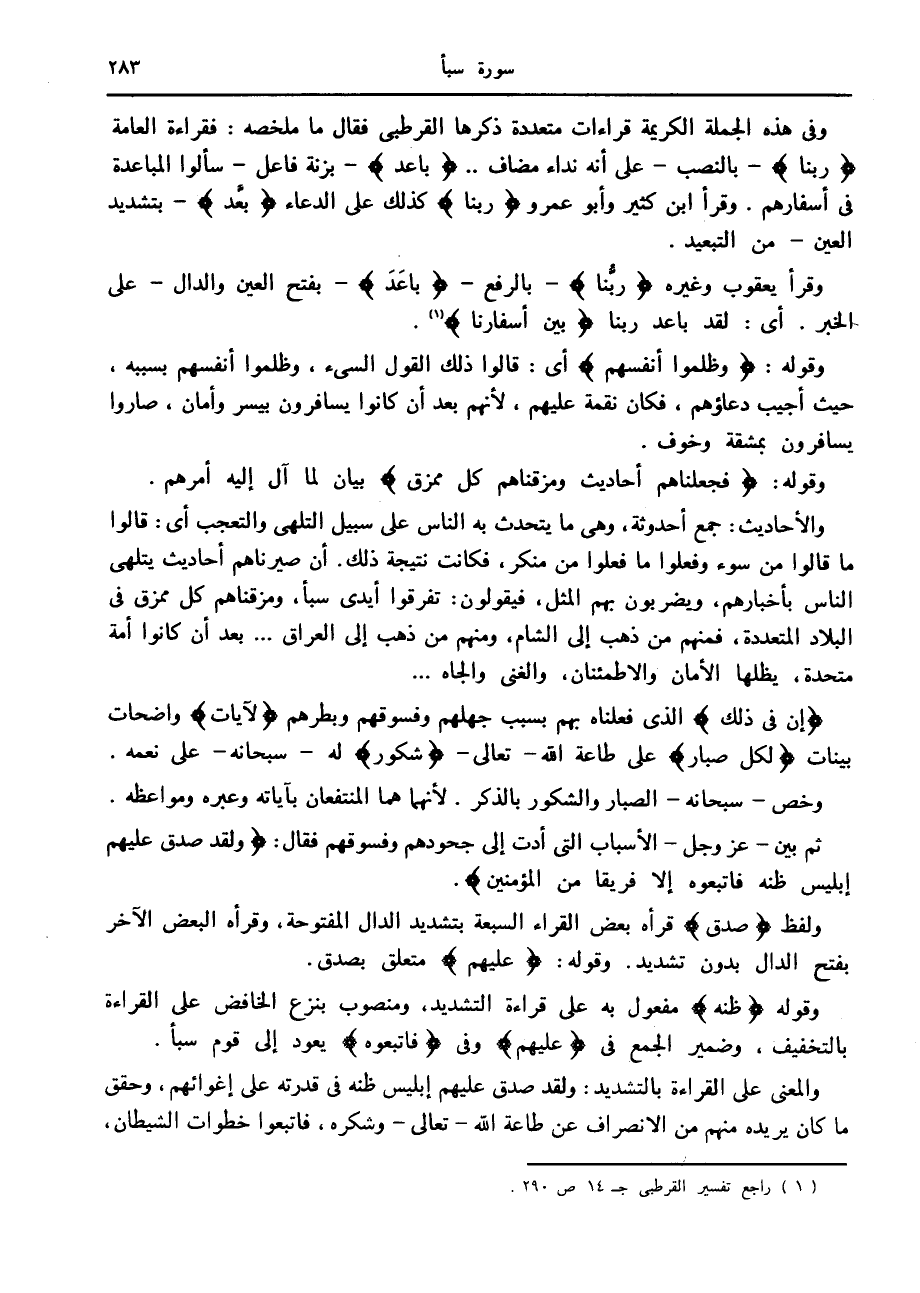 وفي هذه الجملة الكريمة قراءات متعددة ذكرها القرطبي فقال ما ملخصه: فقراءة العامة رَبَّنا- بالنصب- على أنه نداء مضاف.. باعِدْ- بزنة فاعل- سألوا المباعدة في أسفارهم. وقرأ ابن كثير وأبو عمرو رَبَّنا كذلك على الدعاء بعد- بتشديد العين- من التبعيد.