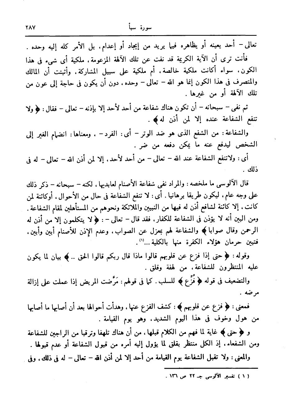 ومن البين أنه لا يؤذن في الشفاعة للكفار، فقد قال- تعالى-: لا يَتَكَلَّمُونَ إِلَّا مَنْ أَذِنَ لَهُ الرَّحْمنُ وَقالَ صَواباً والشفاعة لهم بمعزل عن الصواب، وعدم الإذن للأصنام أبين وأبين، فتبين حرمان هؤلاء الكفرة منها بالكلية ... «1» .
