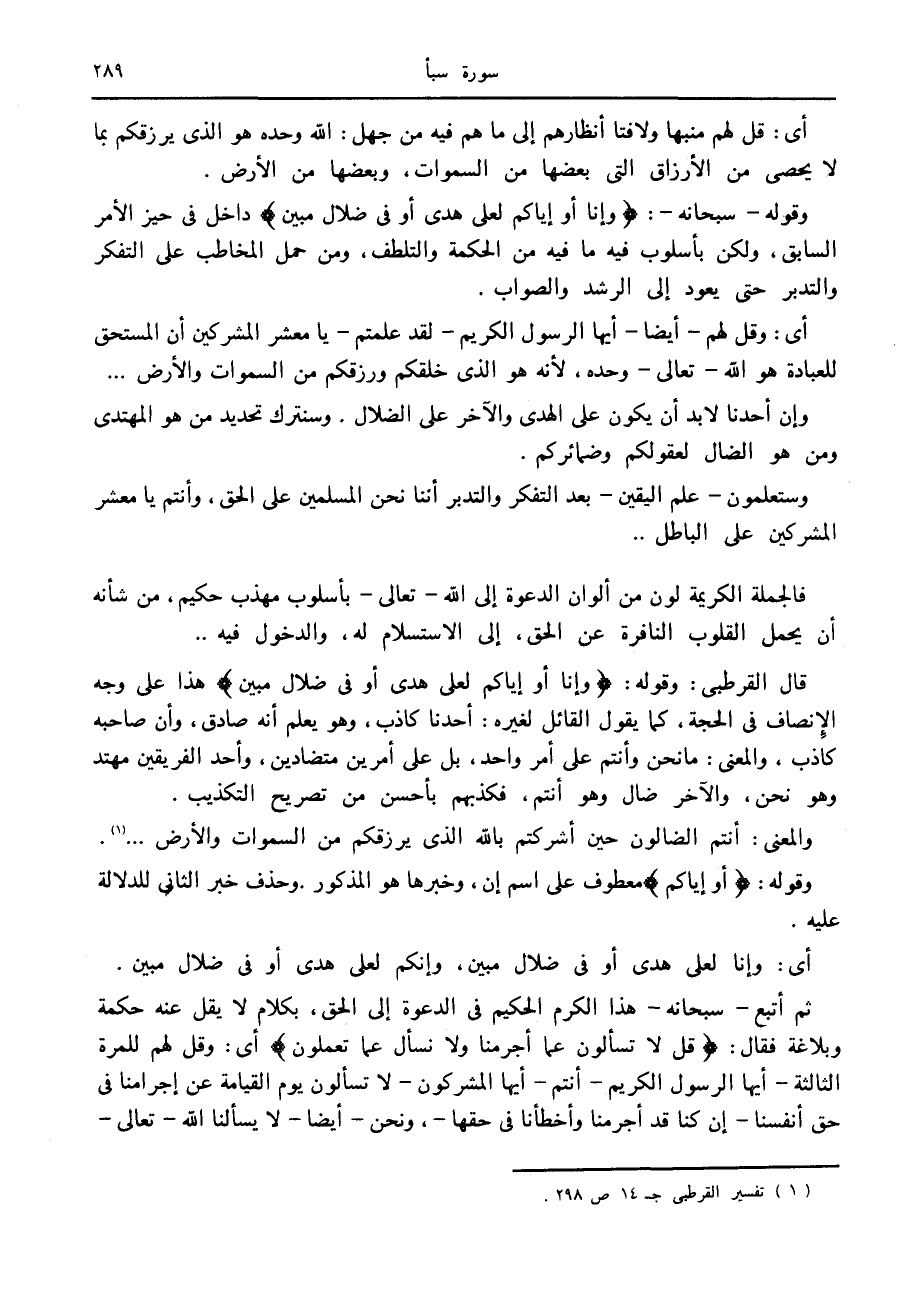 قال القرطبي: وقوله: وَإِنَّا أَوْ إِيَّاكُمْ لَعَلى هُدىً أَوْ فِي ضَلالٍ مُبِينٍ هذا على وجه الإنصاف في الحجة، كما يقول القائل لغيره: أحدنا كاذب، وهو يعلم أنه صادق، وأن صاحبه كاذب، والمعنى: ما نحن وأنتم على أمر واحد، بل على أمرين متضادين، وأحد الفريقين مهتد وهو نحن، والآخر ضال وهو أنتم، فكذبهم بأحسن من تصريح التكذيب.