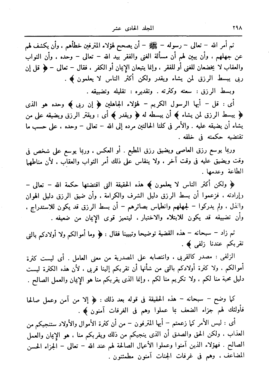 ثم أمر الله- تعالى- رسوله صلّى الله عليه وسلّم أن يصحح لهؤلاء المترفين خطأهم، وأن يكشف لهم عن جهلهم، وأن يبين لهم أن مسألة الغنى والفقر بيد الله- تعالى- وحده، وأن الثواب والعقاب لا يخضعان للغنى أو للفقر، وإنما يتبعان الإيمان أو الكفر، فقال- تعالى- قُلْ إِنَّ رَبِّي يَبْسُطُ الرِّزْقَ لِمَنْ يَشاءُ وَيَقْدِرُ وَلكِنَّ أَكْثَرَ النَّاسِ لا يَعْلَمُونَ.