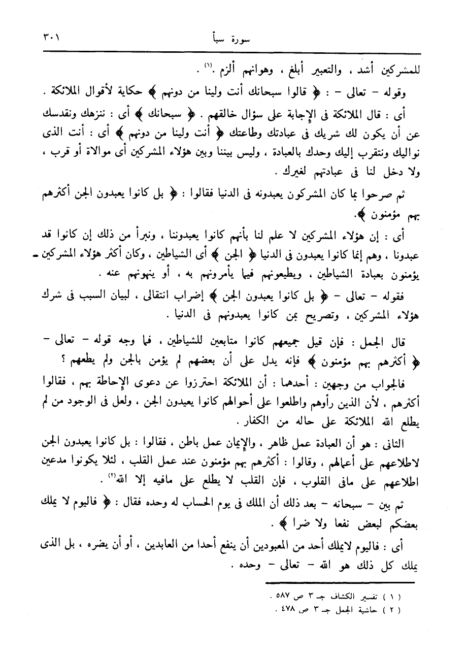 الثاني: هو أن العبادة عمل ظاهر، والإيمان عمل باطن، فقالوا: بل كانوا يعبدون الجن لاطلاعهم على أعمالهم، وقالوا: أكثرهم بهم مؤمنون عند عمل القلب، لئلا يكونوا مدعين اطلاعهم على ما في القلوب، فإن القلب لا يطلع على ما فيه إلا الله «2» .