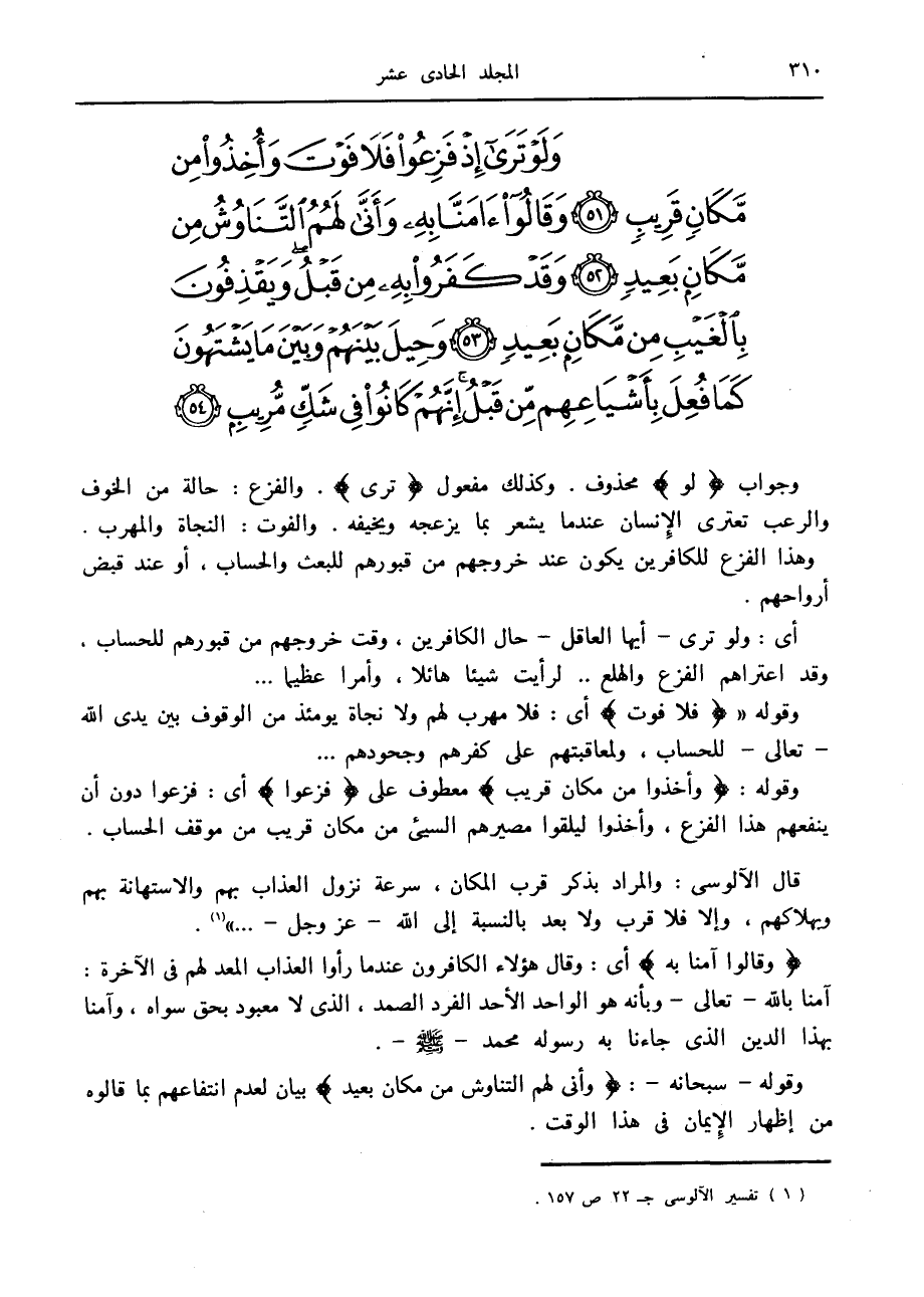 وَلَوْ تَرى إِذْ فَزِعُوا فَلا فَوْتَ وَأُخِذُوا مِنْ مَكانٍ قَرِيبٍ (51) وَقالُوا آمَنَّا بِهِ وَأَنَّى لَهُمُ التَّناوُشُ مِنْ مَكانٍ بَعِيدٍ (52) وَقَدْ كَفَرُوا بِهِ مِنْ قَبْلُ وَيَقْذِفُونَ بِالْغَيْبِ مِنْ مَكانٍ بَعِيدٍ (53) وَحِيلَ بَيْنَهُمْ وَبَيْنَ ما يَشْتَهُونَ كَما فُعِلَ بِأَشْياعِهِمْ مِنْ قَبْلُ إِنَّهُمْ كانُوا فِي شَكٍّ مُرِيبٍ (54)