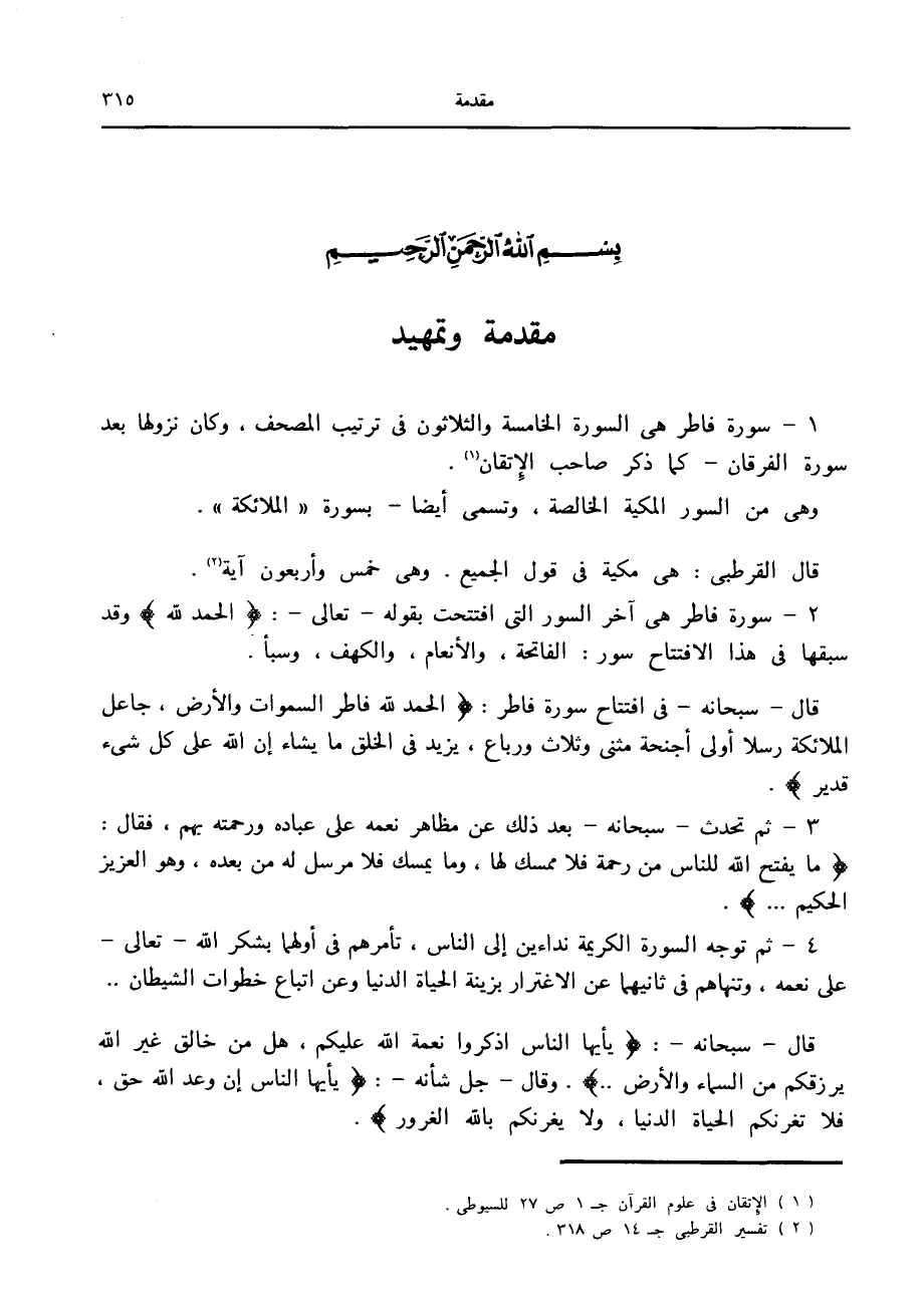 2- سورة فاطر هي آخر السور التي افتتحت بقوله- تعالى-: الْحَمْدُ لِلَّهِ وقد سبقها في هذا الافتتاح سور: الفاتحة، والأنعام، والكهف، وسبأ.