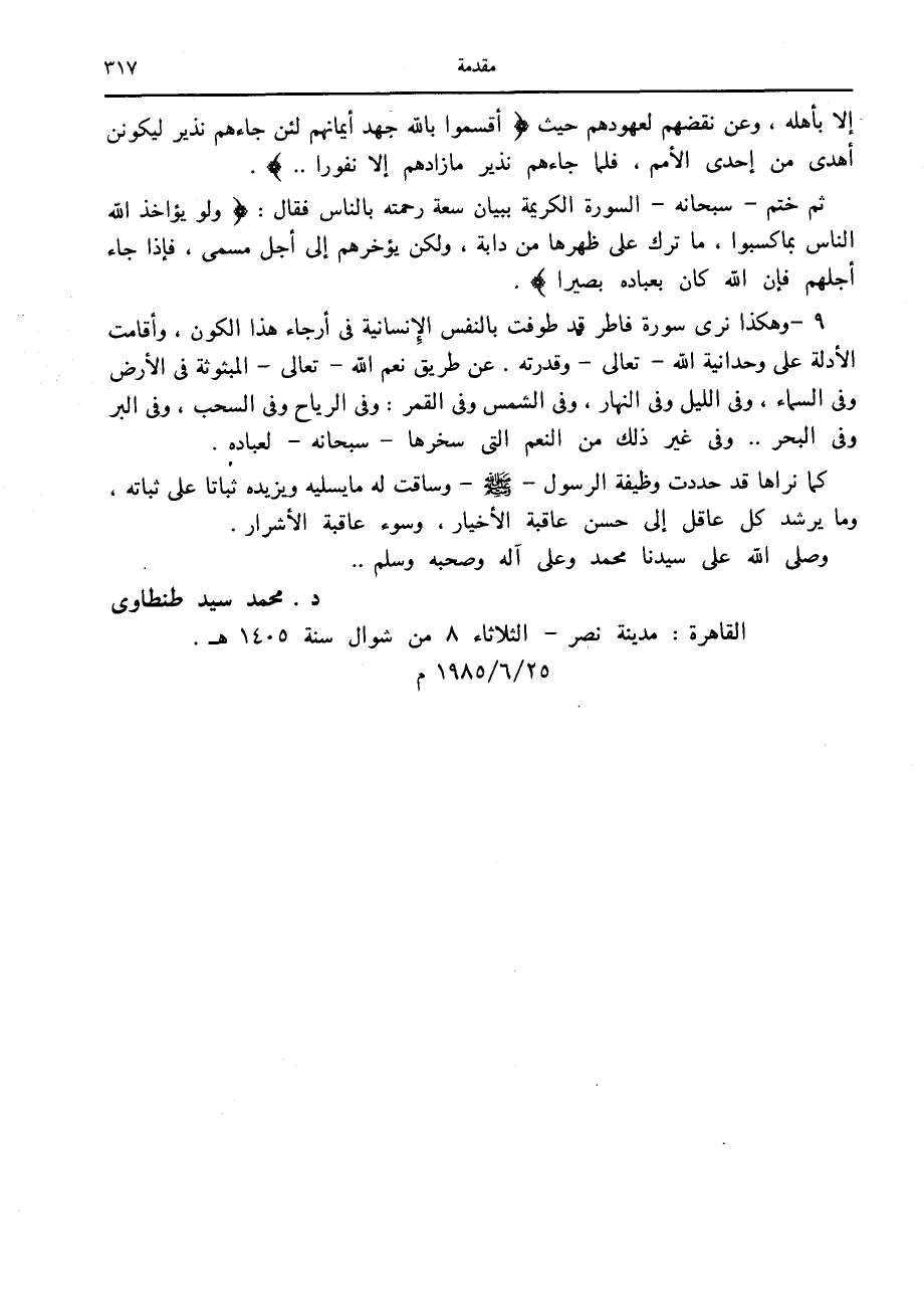 9- وهكذا نرى سورة فاطر قد طوفت بالنفس الإنسانية في أرجاء هذا الكون، وأقامت الأدلة على وحدانية الله- تعالى- وقدرته. عن طريق نعم الله- تعالى- المبثوثة في الأرض وفي السماء، وفي الليل وفي النهار، وفي الشمس وفي القمر: وفي الرياح وفي السحب، وفي البر وفي البحر.. وفي غير ذلك من النعم التي سخرها- سبحانه- لعباده.