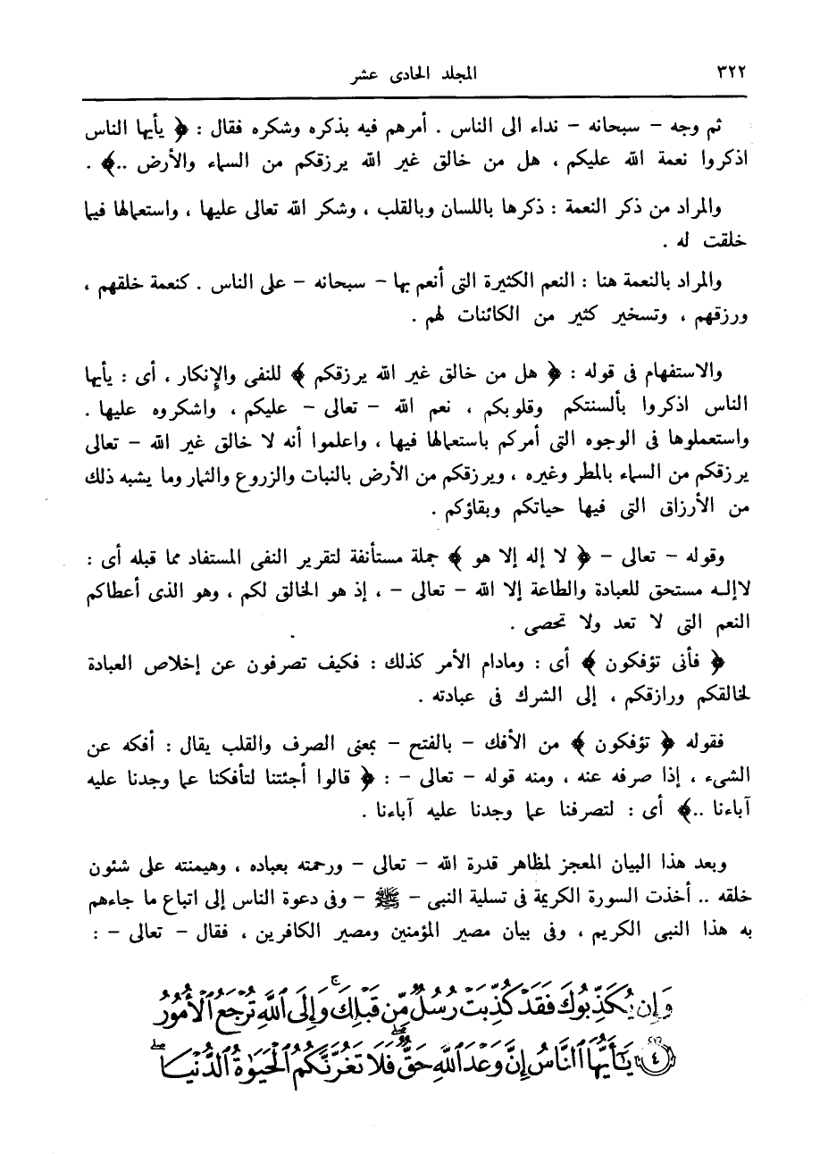 ثم وجه- سبحانه- نداء الى الناس. أمرهم فيه بذكره وشكره فقال: يا أَيُّهَا النَّاسُ اذْكُرُوا نِعْمَتَ اللَّهِ عَلَيْكُمْ، هَلْ مِنْ خالِقٍ غَيْرُ اللَّهِ يَرْزُقُكُمْ مِنَ السَّماءِ وَالْأَرْضِ ...