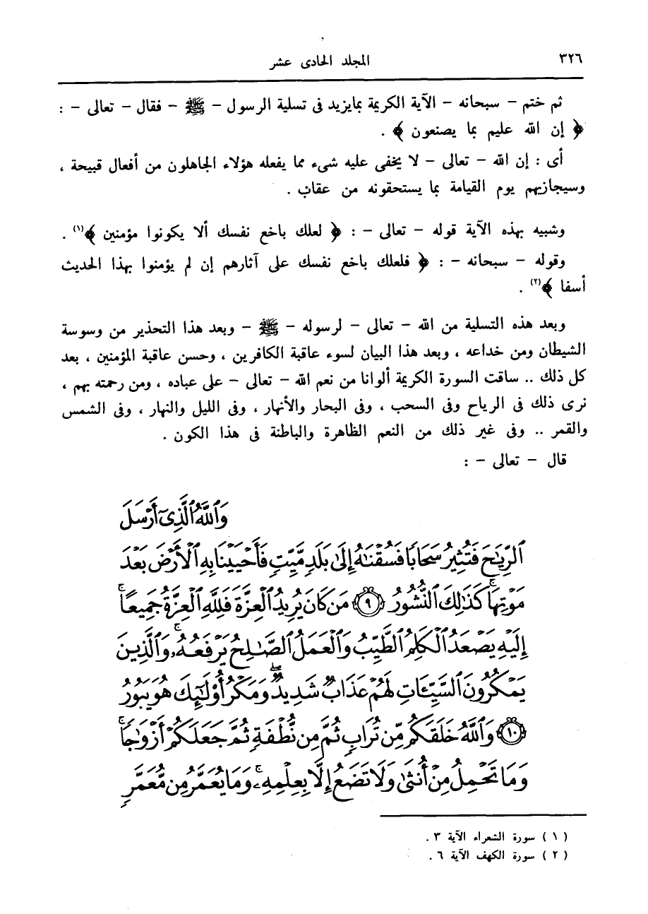 وبعد هذه التسلية من الله- تعالى- لرسوله صلّى الله عليه وسلّم وبعد هذا التحذير من وسوسة الشيطان ومن خداعه، وبعد هذا البيان لسوء عاقبة الكافرين، وحسن عاقبة المؤمنين، بعد كل ذلك.. ساقت السورة الكريمة ألوانا من نعم الله- تعالى- على عباده، ومن رحمته بهم، نرى ذلك في الرياح وفي السحب، وفي البحار والأنهار، وفي الليل نهار، وفي الشمس القمر.. وفي غير ذلك من النعم الظاهرة والباطنة في هذا الكون.