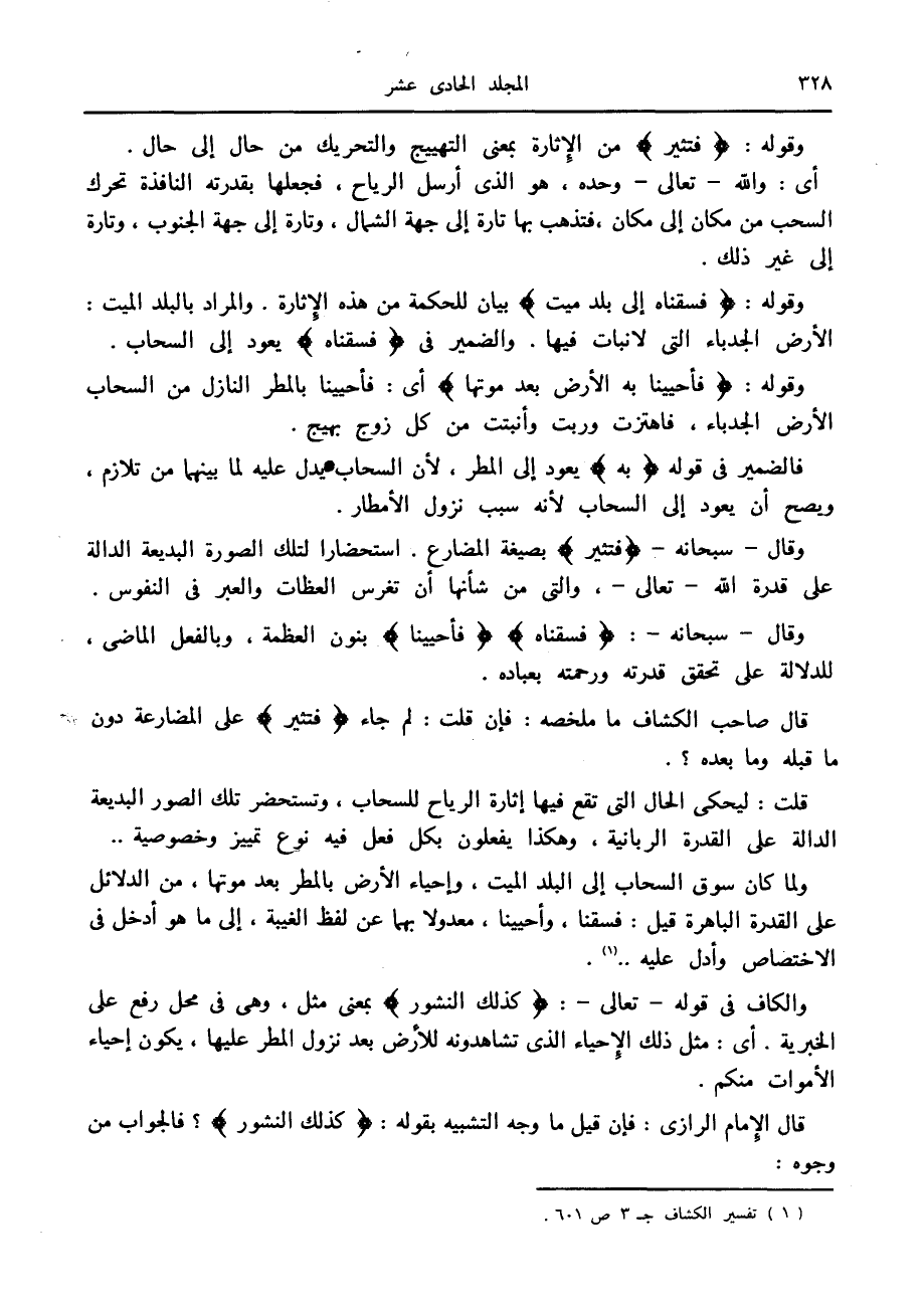 قال الإمام الرازي: فإن قيل ما وجه التشبيه بقوله: كَذلِكَ النُّشُورُ؟ فالجواب من وجوه: