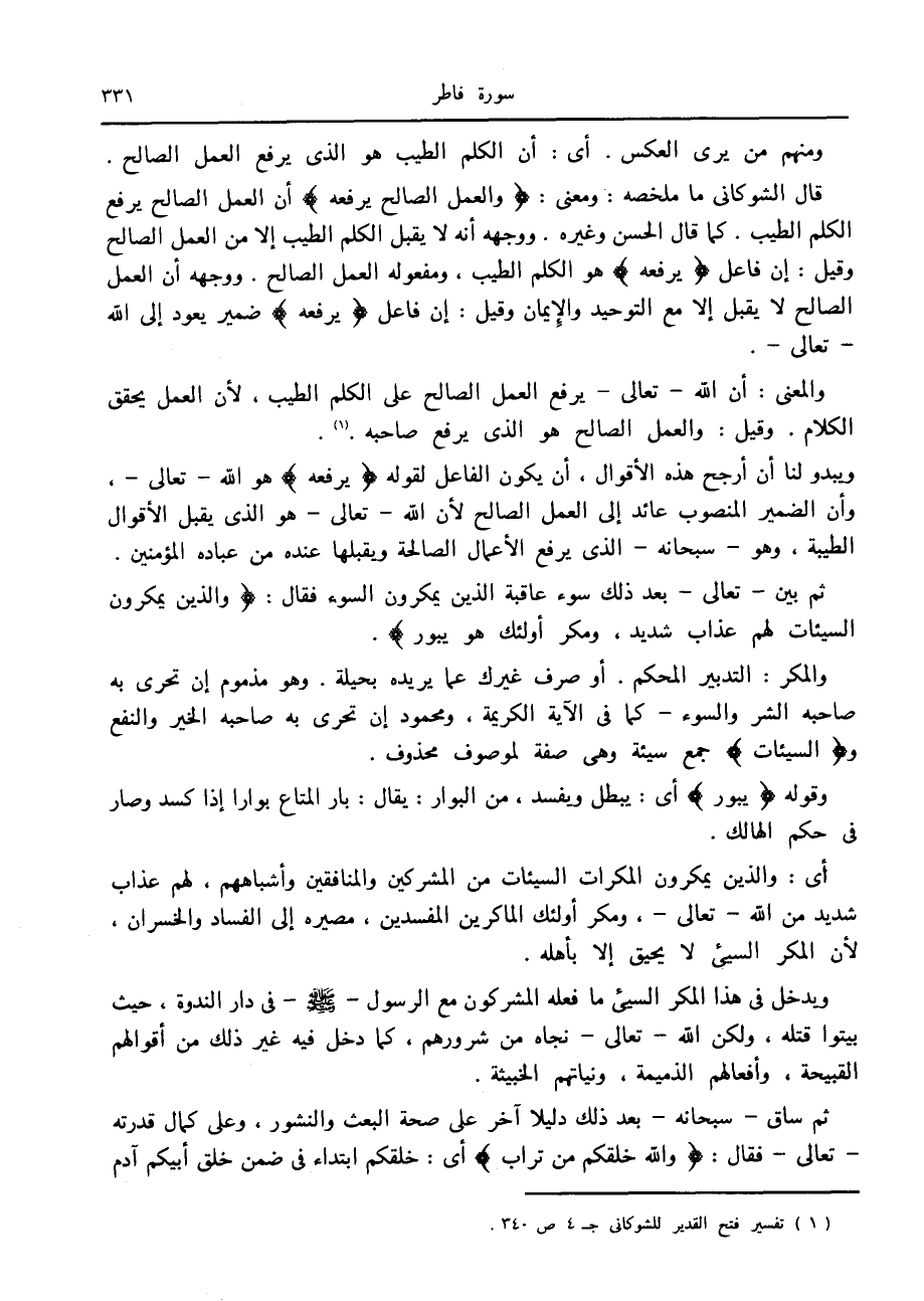 قال الشوكانى ما ملخصه: ومعنى: وَالْعَمَلُ الصَّالِحُ يَرْفَعُهُ أن العمل الصالح يرفع الكلم الطيب. كما قال الحسن وغيره. ووجهه أنه لا يقبل الكلم الطيب إلا من العمل الصالح وقيل: إن فاعل يَرْفَعُهُ هو الكلم الطيب، ومفعوله العمل الصالح. ووجهه أن العمل الصالح لا يقبل إلا مع التوحيد والإيمان وقيل: إن فاعل يَرْفَعُهُ ضمير يعود إلى الله- تعالى-.