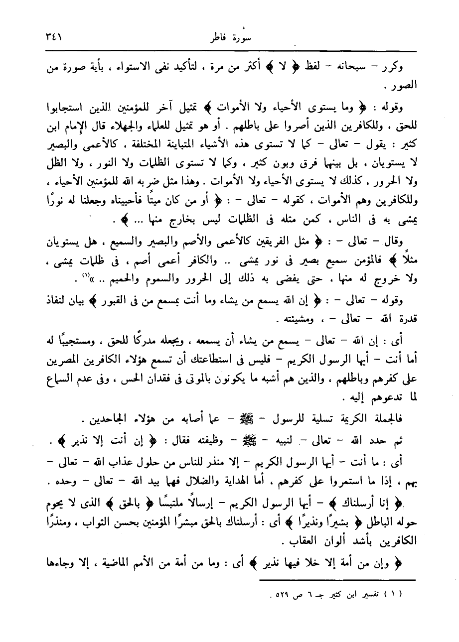 وقوله: وَما يَسْتَوِي الْأَحْياءُ وَلَا الْأَمْواتُ تمثيل آخر للمؤمنين الذين استجابوا للحق، وللكافرين الذين أصروا على باطلهم. أو هو تمثيل للعلماء والجهلاء قال الإمام ابن كثير: يقول- تعالى- كما لا تستوي هذه الأشياء المتباينة المختلفة، كالأعمى والبصير لا يستويان، بل بينهما فرق وبون كثير، وكما لا تستوي الظلمات ولا النور، ولا الظل ولا الحرور، كذلك لا يستوي الأحياء ولا الأموات. وهذا مثل ضربه الله للمؤمنين الأحياء، وللكافرين وهم الأموات، كقوله- تعالى-: أَوَمَنْ كانَ مَيْتاً فَأَحْيَيْناهُ وَجَعَلْنا لَهُ نُوراً يَمْشِي بِهِ فِي النَّاسِ، كَمَنْ مَثَلُهُ فِي الظُّلُماتِ لَيْسَ بِخارِجٍ مِنْها ...