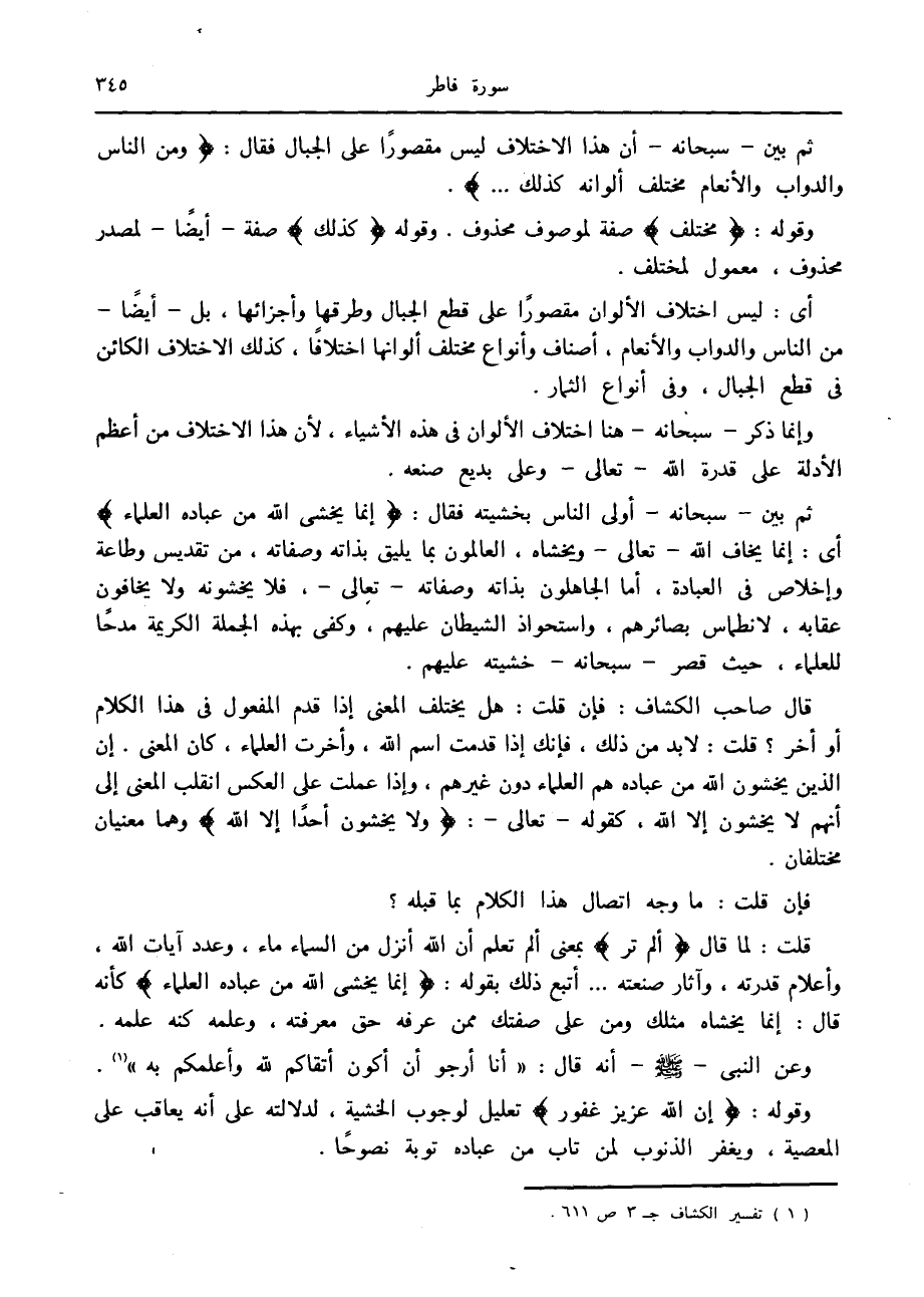 قال صاحب الكشاف: فإن قلت: هل يختلف المعنى إذا قدم المفعول في هذا الكلام أو أخر؟ قلت: لا بد من ذلك، فإنك إذا قدمت اسم الله، وأخرت العلماء، كان المعنى. إن الذين يخشون الله من عباده هم العلماء دون غيرهم، وإذا عملت على العكس انقلب المعنى إلى أنهم لا يخشون إلا الله، كقوله- تعالى-: وَلا يَخْشَوْنَ أَحَداً إِلَّا اللَّهَ وهما معنيان مختلفان.