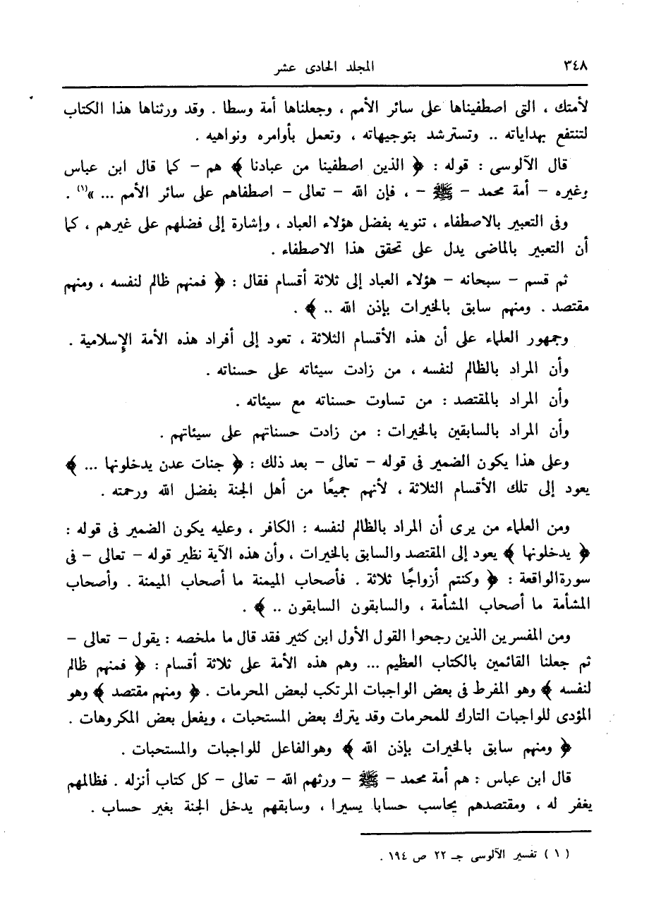 وجمهور العلماء على أن هذه الأقسام الثلاثة، تعود إلى أفراد هذه الأمة الإسلامية.