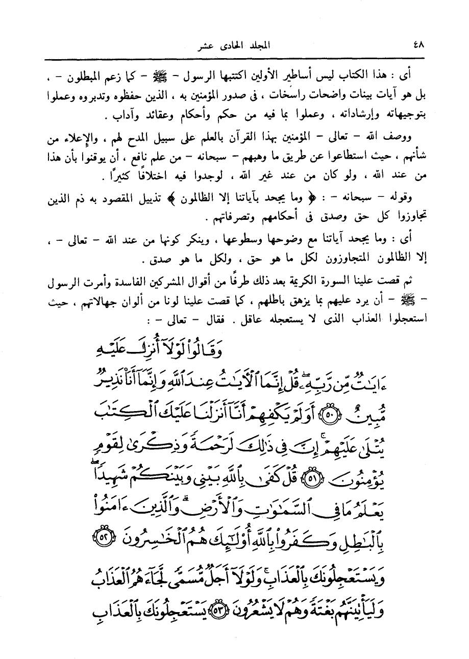 ثم قصت علينا السورة الكريمة بعد ذلك طرفا من أقوال المشركين الفاسدة وأمرت الرسول صلى الله عليه وسلم أن يرد عليهم بما يزهق باطلهم، كما قصت علينا لونا من ألوان جهالاتهم، حيث استعجلوا العذاب الذي لا يستعجله عاقل. فقال- تعالى-: