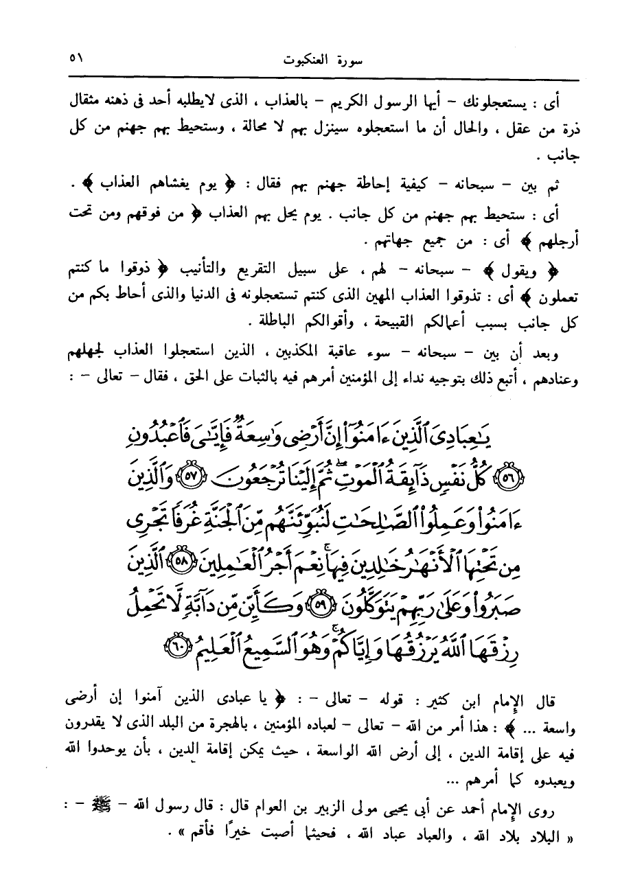 يا عِبادِيَ الَّذِينَ آمَنُوا إِنَّ أَرْضِي واسِعَةٌ فَإِيَّايَ فَاعْبُدُونِ (56) كُلُّ نَفْسٍ ذائِقَةُ الْمَوْتِ ثُمَّ إِلَيْنا تُرْجَعُونَ (57) وَالَّذِينَ آمَنُوا وَعَمِلُوا الصَّالِحاتِ لَنُبَوِّئَنَّهُمْ مِنَ الْجَنَّةِ غُرَفاً تَجْرِي مِنْ تَحْتِهَا الْأَنْهارُ خالِدِينَ فِيها نِعْمَ أَجْرُ الْعامِلِينَ (58) الَّذِينَ صَبَرُوا وَعَلى رَبِّهِمْ يَتَوَكَّلُونَ (59) وَكَأَيِّنْ مِنْ دَابَّةٍ لا تَحْمِلُ رِزْقَهَا اللَّهُ يَرْزُقُها وَإِيَّاكُمْ وَهُوَ السَّمِيعُ الْعَلِيمُ (60)