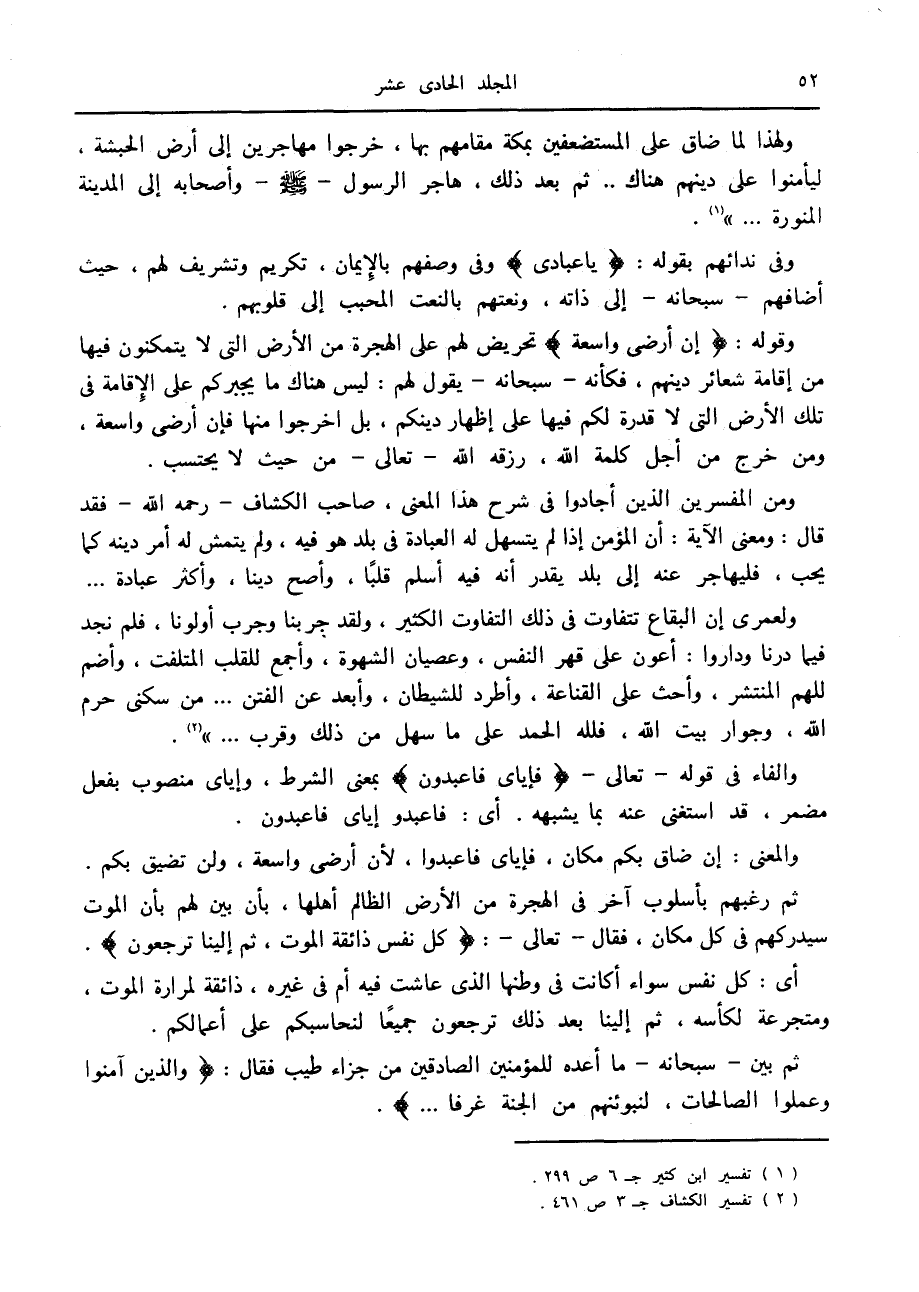 ومن المفسرين الذين أجادوا في شرح هذا المعنى، صاحب الكشاف- رحمه الله- فقد قال: ومعنى الآية: أن المؤمن إذا لم يتسهل له العبادة في بلد هو فيه، ولم يتمش له أمر دينه كما يحب، فليهاجر عنه إلى بلد يقدر أنه فيه أسلم قلبا، وأصح دينا، وأكثر عبادة ...