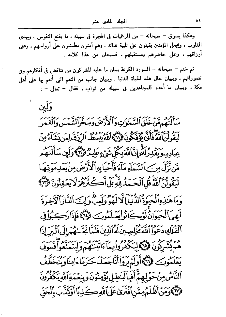 ثم ختم- سبحانه- السورة الكريمة ببيان ما عليه المشركون من تناقض في أفكارهم وفي تصوراتهم، وببيان حال هذه الحياة الدنيا. وببيان جانب من النعم التي أنعم بها على أهل مكة، وببيان ما أعده للمجاهدين في سبيله من ثواب، فقال- تعالى-: