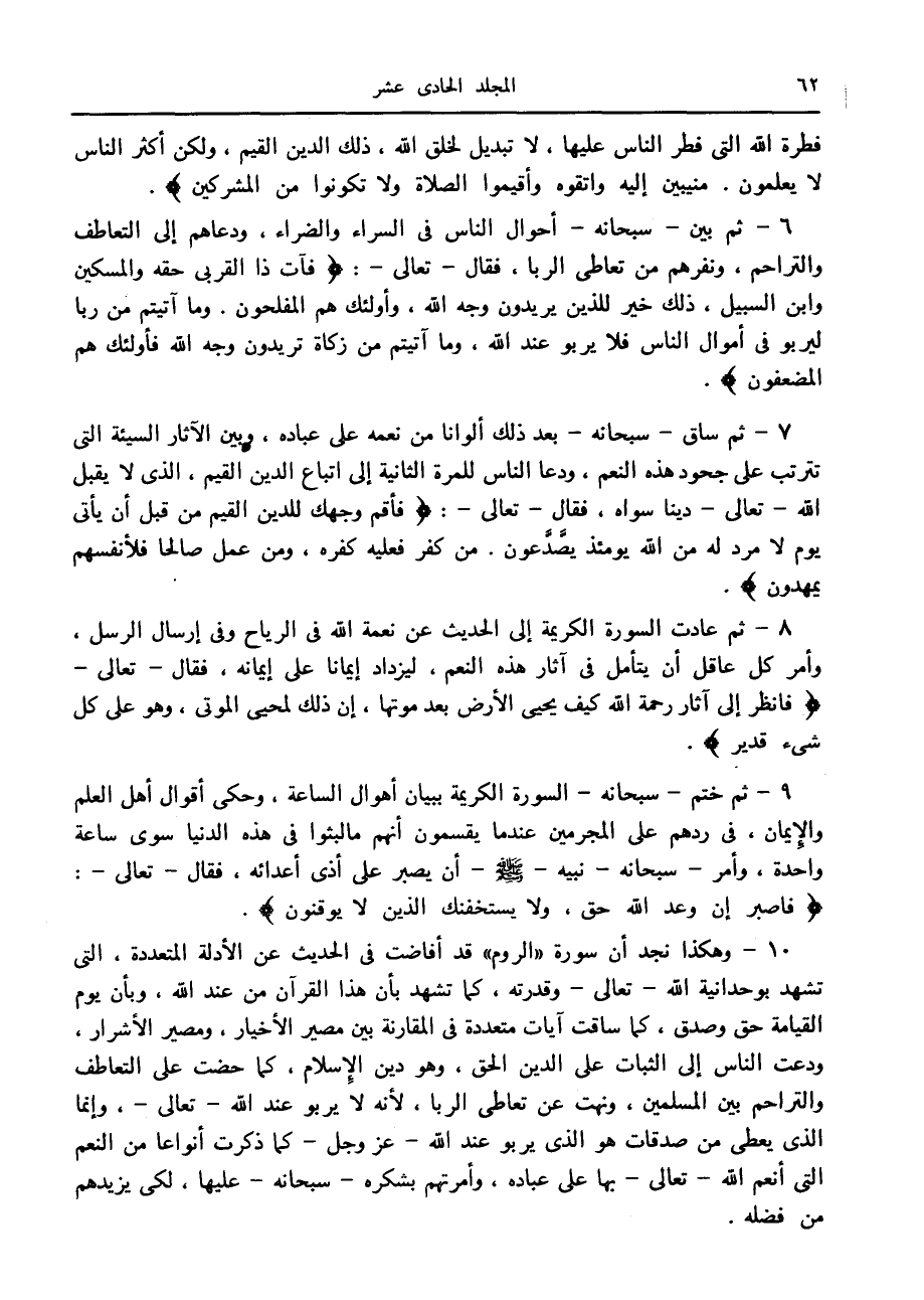10- وهكذا نجد أن سورة «الروم» قد أفاضت في الحديث عن الأدلة المتعددة، التي تشهد بوحدانية الله- تعالى- وقدرته، كما تشهد بأن هذا القرآن من عند الله، وبأن يوم القيامة حق وصدق، كما ساقت آيات متعددة في المقارنة بين مصير الأخيار، ومصير الأشرار، ودعت الناس إلى الثبات على الدين الحق، وهو دين الإسلام، كما حضت على التعاطف والتراحم بين المسلمين، ونهت عن تعاطى الربا، لأنه لا يربو عند الله- تعالى-، وإنما الذي يعطى من صدقات هو الذي يربو عند الله- عز وجل- كما ذكرت أنواعا من النعم التي أنعم الله- تعالى- بها على عباده، وأمرتهم بشكره- سبحانه- عليها، لكي يزيدهم من فضله.