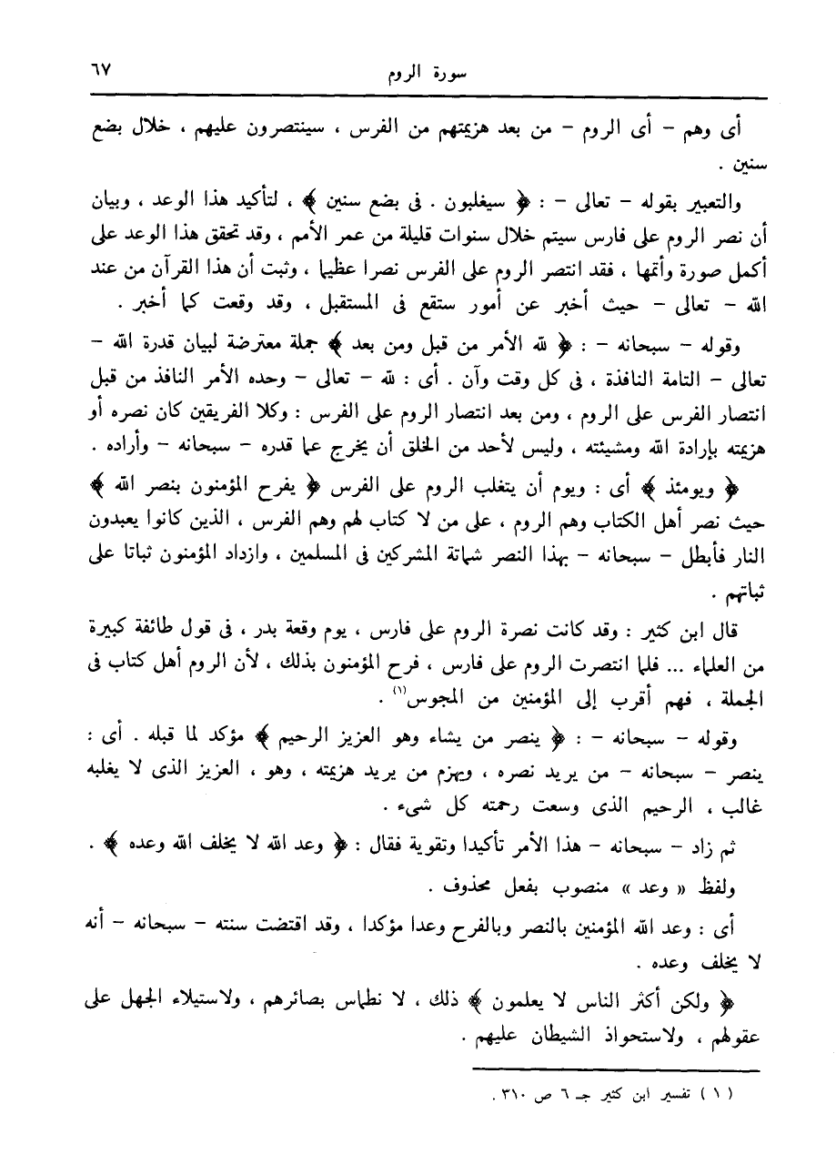 قال ابن كثير: وقد كانت نصرة الروم على فارس، يوم وقعة بدر، في قول طائفة كبيرة من العلماء ... فلما انتصرت الروم على فارس، فرح المؤمنون بذلك، لأن الروم أهل كتاب في الجملة، فهم أقرب إلى المؤمنين من المجوس «1» .