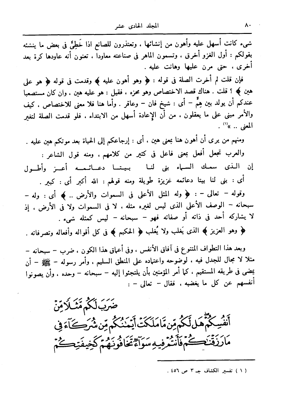 فإن قلت لم أخرت الصلة في قوله: وَهُوَ أَهْوَنُ عَلَيْهِ وقدمت في قوله هُوَ عَلَيَّ هَيِّنٌ؟ قلت. هناك قصد الاختصاص وهو محزه، فقيل: هو عليه هين، وان كان مستصعبا عندكم أن يولد بين همل- أى: شيخ فان- وعاقر. وأما هنا فلا معنى للاختصاص، كيف والأمر مبنى على ما يعقلون، من أن الإعادة أسهل من الابتداء، فلو قدمت الصلة لتغير المعنى..» «1» .