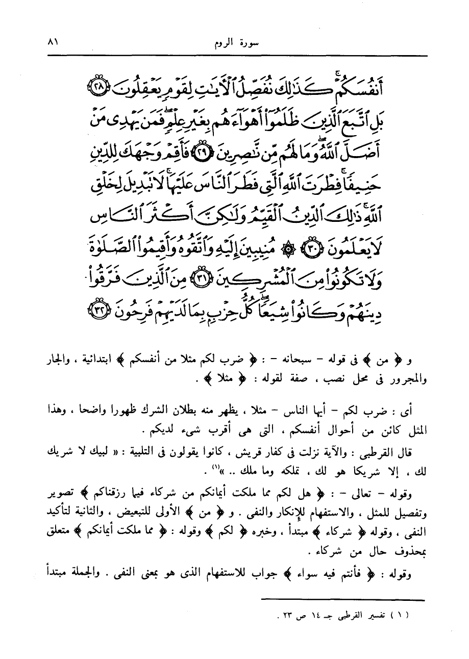 ضَرَبَ لَكُمْ مَثَلاً مِنْ أَنْفُسِكُمْ هَلْ لَكُمْ مِنْ ما مَلَكَتْ أَيْمانُكُمْ مِنْ شُرَكاءَ فِي ما رَزَقْناكُمْ فَأَنْتُمْ فِيهِ سَواءٌ تَخافُونَهُمْ كَخِيفَتِكُمْ أَنْفُسَكُمْ كَذلِكَ نُفَصِّلُ الْآياتِ لِقَوْمٍ يَعْقِلُونَ (28) بَلِ اتَّبَعَ الَّذِينَ ظَلَمُوا أَهْواءَهُمْ بِغَيْرِ عِلْمٍ فَمَنْ يَهْدِي مَنْ أَضَلَّ اللَّهُ وَما لَهُمْ مِنْ ناصِرِينَ (29) فَأَقِمْ وَجْهَكَ لِلدِّينِ حَنِيفاً فِطْرَتَ اللَّهِ الَّتِي فَطَرَ النَّاسَ عَلَيْها لا تَبْدِيلَ لِخَلْقِ اللَّهِ ذلِكَ الدِّينُ الْقَيِّمُ وَلكِنَّ أَكْثَرَ النَّاسِ لا يَعْلَمُونَ (30) مُنِيبِينَ إِلَيْهِ وَاتَّقُوهُ وَأَقِيمُوا الصَّلاةَ وَلا تَكُونُوا مِنَ الْمُشْرِكِينَ (31) مِنَ الَّذِينَ فَرَّقُوا دِينَهُمْ وَكانُوا شِيَعاً كُلُّ حِزْبٍ بِما لَدَيْهِمْ فَرِحُونَ (32)