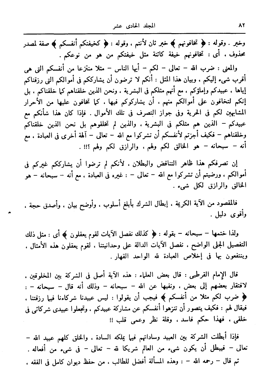 ضَرَبَ لَكُمْ مَثَلًا مِنْ أَنْفُسِكُمْ فيجب أن يقولوا: ليس عبيدنا شركاءنا فيما رزقتنا، فيقال لهم: فكيف يتصور أن تنزهوا أنفسكم عن مشاركة عبيدكم، وتجعلوا عبيدي شركائى في خلقي، فهذا حكم فاسد، وقلة نظر وعمى قلب!! فإذا أبطلت الشركة بين العبيد وساداتهم فيما يملكه السادة، والخلق كلهم عبيد الله- تعالى- فيبطل أن يكون شيء من العالم شريكا لله- تعالى- في شيء من أفعاله.