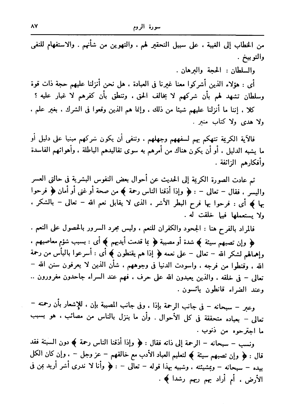 فالآية الكريمة تتهكم بهم لسفههم وجهلهم، وتنفى أن يكون شركهم مبنيا على دليل أو ما يشبه الدليل، أو أن يكون هناك من أمرهم به سوى تقاليدهم الباطلة، وأهوائهم الفاسدة وأفكارهم الزائفة.