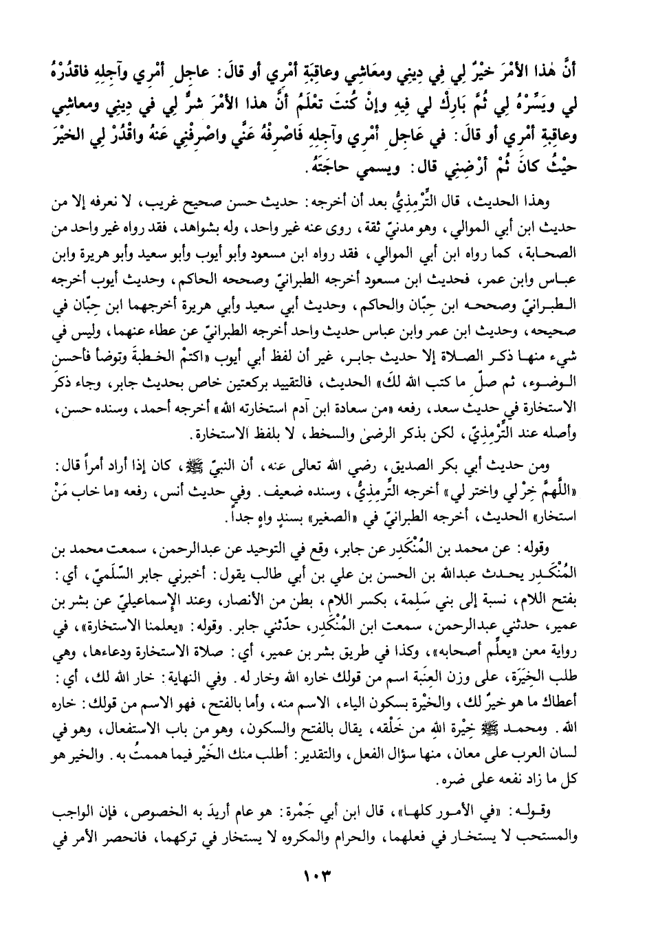 وهذا الحديث، قال التِّرْمِذِيُّ بعد أن أخرجه: حديث حسن صحيح غريب، لا نعرفه إلا من حديث ابن أبي الموالي، وهو مدنيّ ثقة، روى عنه غير واحد، وله بشواهد، فقد رواه غير واحد من الصحابة، كما رواه ابن أبي الموالي، فقد رواء ابن مسعود وأبو أيوب وأبو سعيد وأبو هريرة وابن عباس وابن عمر، فحديث ابن مسعود أخرجه الطبرانيّ وصححه الحاكم، وحديث أيوب أخرجه الطبرانيّ وصححه ابن حِبّان والحاكم، وحديث أبي سعيد وأبي هريرة أخرجهما ابن حِبّان في صحيحه، وحديث ابن عمر وابن عباس حديث واحد أخرجه الطبرانيّ عن عطاء عنهما، وليس في شيء منها ذكر الصلاة إلا حديث جابر، غير أن لفظ أبي أيوب "كتمْ الخطبةَ وتوضأ فأحسنِ الوضوء، ثم صلِّ ما كتب الله لكَ" الحديث، فالتقييد بركعتين خاص بحديث جابر، وجاء ذكر الاستخارة في حديث سعد، رفعه "من سعادة ابن آدم استخارته الله" أخرجه أحمد، وسنده حسن، وأصله عند التِّرْمِذِيّ، لكن بذكر الرضى والسخط، لا بلفظ الاستخارة.