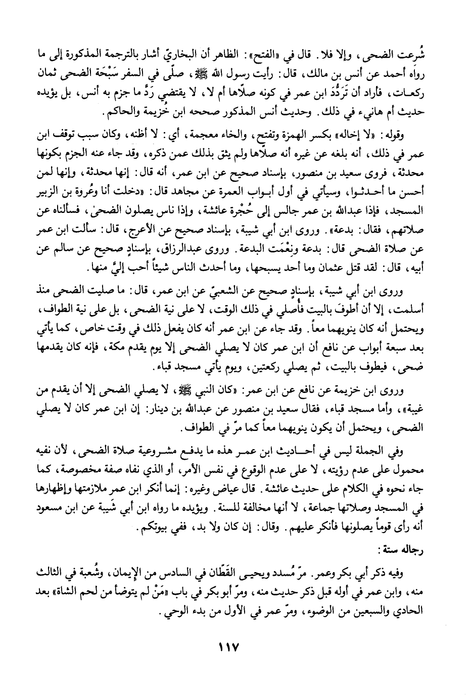 وروى ابن خزيمة عن نافع عن ابن عمر: "كان النبي -صلى الله عليه وسلم-، لا يصلي الضحى إلا أن يقدم من غيبة"، وأما مسجد قباء، فقال سعيد بن منصور عن عبد الله بن دينار: إن ابن عمر كان لا يصلي الضحى، ويحتمل أن يكون ينويهما معًا كما مرّ في الطواف.