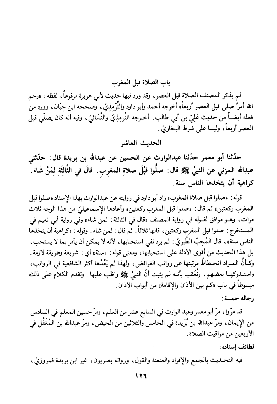 حَدَّثَنَا أَبُو مَعْمَرٍ حَدَّثَنَا عَبْدُ الْوَارِثِ عَنِ الْحُسَيْنِ عَنِ عبد الله ابْنِ بُرَيْدَةَ قَالَ: حَدَّثَنِي عَبْدُ اللَّهِ الْمُزَنِيُّ عَنِ النَّبِيِّ -صلى الله عليه وسلم- قَالَ: صَلُّوا قَبْلَ صَلاَةِ الْمَغْرِبِ. قَالَ فِي الثَّالِثَةِ لِمَنْ شَاءَ كَرَاهِيَةَ أَنْ يَتَّخِذَهَا النَّاسُ سُنَّةً.