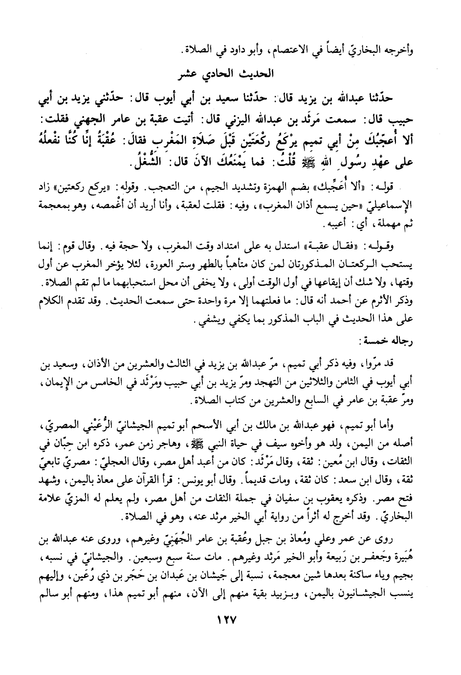 قد مرّوا، وفيه ذكر أبي تميم، مرّ عبد الله بن يزيد في الثالث والعشرين من الأذان، وسعيد بن أبي أيوب في الثامن والثلاثين من التهجد ومرّ يزيد بن أبي حبيب ومَرْثَد في الخامس من الإيمان، ومرّ عقبة بن عامر في السابع والعشرين من كتاب الصلاة.