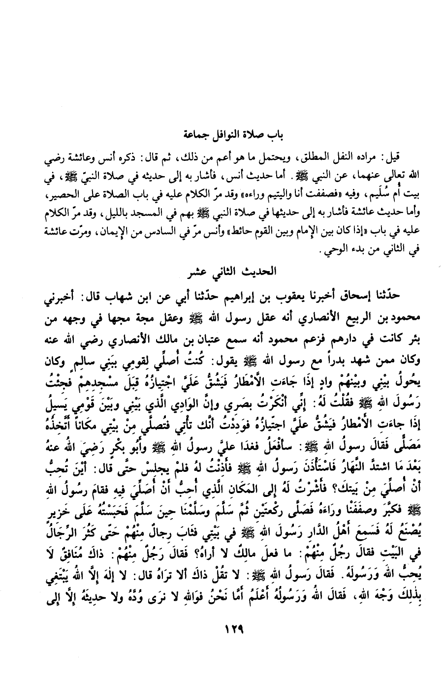 حَدَّثَنِي إِسْحَاقُ أخبرنا يَعْقُوبُ بْنُ إِبْرَاهِيمَ حَدَّثَنَا أَبِي عَنِ ابْنِ شِهَابٍ قَالَ: أَخْبَرَنِي مَحْمُودُ بْنُ الرَّبِيعِ الأَنْصَارِيُّ أَنَّهُ عَقَلَ رَسُولَ اللَّهِ -صلى الله عليه وسلم-، وَعَقَلَ مَجَّةً مَجَّهَا فِي وَجْهِهِ مِنْ بِئْرٍ كَانَتْ فِي دَارِهِمْ. فَزَعَمَ مَحْمُودٌ أَنَّهُ سَمِعَ عِتْبَانَ بْنَ مَالِكٍ الأَنْصَارِيَّ رضي الله عنه وَكَانَ مِمَّنْ شَهِدَ بَدْرًا مَعَ رَسُولِ اللَّهِ -صلى الله عليه وسلم- يَقُولُ: كُنْتُ أُصَلِّي لِقَوْمِي بِبَنِي سَالِمٍ، وَكَانَ يَحُولُ بَيْنِي وَبَيْنَهُمْ وَادٍ إِذَا جَاءَتِ الأَمْطَارُ فَيَشُقُّ عَلَىَّ اجْتِيَازُهُ قِبَلَ مَسْجِدِهِمْ، فَجِئْتُ رَسُولَ اللَّهِ -صلى الله عليه وسلم- فَقُلْتُ لَهُ: إِنِّي أَنْكَرْتُ بَصَرِي، وَإِنَّ الْوَادِيَ الَّذِي بَيْنِي وَبَيْنَ قَوْمِي يَسِيلُ إِذَا جَاءَتِ الأَمْطَارُ فَيَشُقُّ عَلَيَّ اجْتِيَازُهُ، فَوَدِدْتُ أَنَّكَ تَأْتِي فَتُصَلِّي مِنْ بَيْتِي مَكَانًا أَتَّخِذُهُ مُصَلًّى. فَقَالَ رَسُولُ اللَّهِ -صلى الله عليه وسلم-: سَأَفْعَلُ. فَغَدَا عَلَيَّ رَسُولُ اللَّهِ -صلى الله عليه وسلم- وَأَبُو بَكْرٍ رضي الله عنه بَعْدَمَا اشْتَدَّ النَّهَارُ فَاسْتَأْذَنَ رَسُولُ اللَّهِ -صلى الله عليه وسلم- فَأَذِنْتُ لَهُ فَلَمْ يَجْلِسْ حَتَّى قَالَ: أَيْنَ تُحِبُّ أَنْ أُصَلِّيَ مِنْ بَيْتِكَ؟. فَأَشَرْتُ لَهُ إِلَى الْمَكَانِ الَّذِي أُحِبُّ أَنْ أُصَلِّيَ فِيهِ، فَقَامَ رَسُولُ اللَّهِ -صلى الله عليه وسلم- فَكَبَّرَ وَصَفَفْنَا وَرَاءَهُ، فَصَلَّى رَكْعَتَيْنِ، ثُمَّ سَلَّمَ وَسَلَّمْنَا حِينَ سَلَّمَ، فَحَبَسْتُهُ عَلَى خَزِيرٍ يُصْنَعُ لَهُ فَسَمِعَ أَهْلُ الدَّارِ رَسُولَ اللَّهِ -صلى الله عليه وسلم- فِي بَيْتِي فَثَابَ رِجَالٌ مِنْهُمْ حَتَّى كَثُرَ الرِّجَالُ فِي الْبَيْتِ. فَقَالَ رَجُلٌ مِنْهُمْ: مَا فَعَلَ مَالِكٌ لاَ أَرَاهُ؟. فَقَالَ رَجُلٌ مِنْهُمْ: ذَاكَ مُنَافِقٌ لاَ يُحِبُّ اللَّهَ وَرَسُولَهُ. فَقَالَ رَسُولُ اللَّهِ -صلى الله عليه وسلم-: لاَ تَقُلْ ذَاكَ أَلاَ تَرَاهُ قَالَ: لاَ إِلَهَ إِلاَّ اللَّهُ. يَبْتَغِي بِذَلِكَ وَجْهَ اللَّهِ. فَقَالَ اللَّهُ وَرَسُولُهُ أَعْلَمُ. أَمَّا نَحْنُ فَوَاللَّهِ لاَ نَرَى وُدَّهُ وَلاَ حَدِيثَهُ إِلاَّ إِلَى