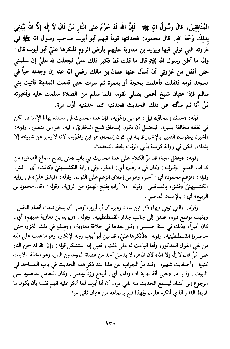 الْمُنَافِقِينَ. قَالَ رَسُولُ اللَّهِ -صلى الله عليه وسلم-: فَإِنَّ اللَّهَ قَدْ حَرَّمَ عَلَى النَّارِ مَنْ قَالَ لاَ إِلَهَ إِلاَّ اللَّهُ. يَبْتَغِي بِذَلِكَ وَجْهَ اللَّهِ. قَالَ مَحْمُودٌ: فَحَدَّثْتُهَا قَوْمًا فِيهِمْ أَبُو أَيُّوبَ صَاحِبُ رَسُولِ اللَّهِ -صلى الله عليه وسلم- فِي غَزْوَتِهِ الَّتِي تُوُفِّيَ فِيهَا وَيَزِيدُ بْنُ مُعَاوِيَةَ عَلَيْهِمْ بِأَرْضِ الرُّومِ، فَأَنْكَرَهَا عَلَيَّ أَبُو أَيُّوبَ قَالَ: وَاللَّهِ مَا أَظُنُّ رَسُولَ اللَّهِ -صلى الله عليه وسلم- قَالَ مَا قُلْتَ قَطُّ. فَكَبُرَ ذَلِكَ عَلَيَّ فَجَعَلْتُ لِلَّهِ عَلَيَّ إِنْ سَلَّمَنِي حَتَّى أَقْفُلَ مِنْ غَزْوَتِي أَنْ أَسْأَلَ عَنْهَا عِتْبَانَ بْنَ مَالِكٍ رضي الله عنه إِنْ وَجَدْتُهُ حَيًّا فِي مَسْجِدِ قَوْمِهِ، فَقَفَلْتُ فَأَهْلَلْتُ بِحَجَّةٍ أَوْ بِعُمْرَةٍ، ثُمَّ سِرْتُ حَتَّى قَدِمْتُ الْمَدِينَةَ فَأَتَيْتُ بَنِي سَالِمٍ، فَإِذَا عِتْبَانُ شَيْخٌ أَعْمَى يُصَلِّي لِقَوْمِهِ فَلَمَّا سَلَّمَ مِنَ الصَّلاَةِ سَلَّمْتُ عَلَيْهِ وَأَخْبَرْتُهُ مَنْ أَنَا، ثُمَّ سَأَلْتُهُ عَنْ ذَلِكَ الْحَدِيثِ فَحَدَّثَنِيهِ كَمَا حَدَّثَنِيهِ أَوَّلَ مَرَّةٍ.