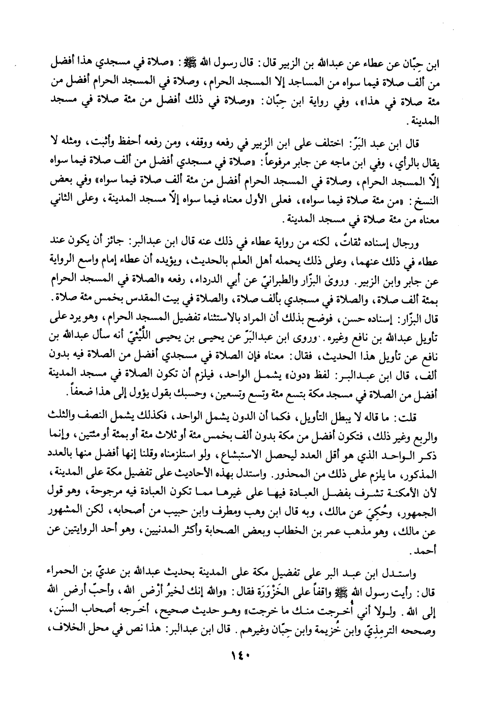 ورجال إسناده ثقاتٌ، لكنه من رواية عطاء في ذلك عنه قال ابن عبد البر: جائز أن يكون عند عطاء في ذلك عنهما، وعلى ذلك يحمله أهل العلم بالحديث، ويؤيده أن عطاء إمام واسع الرواية عن جابر وابن الزبير. وروى البزّار والطبرانيّ عن أبي الدرداء، رفعه "الصلاة في المسجد الحرام بمئة ألف صلاة، والصلاة في مسجدي بألف صلاة، والصلاة في بيت المقدس بخمس مئة صلاة. قال البزّار: إسناده حسن، فوضح بذلك أن المراد بالاستثناء تفضيل المسجد الحرام، وهو يرد على تأويل عبد الله بن نافع وغيره. وروى ابن عبد البَرّ عن يحيى بن يحيى اللَّيْثيّ أنه سأل عبد الله بن نافع عن تأويل هذا الحديث، فقال: معناه فإن الصلاة في مسجدي أفضل من الصلاة فيه بدون ألف، قال ابن عبد البر: لفظ "دون" يشمل الواحد، فيلزم أن تكون الصلاة في مسجد المدينة أفضل من الصلاة في مسجد مكة بتسع مئة وتسع وتسعين، وحسبك بقول يؤول إلى هذا ضعفًا.
