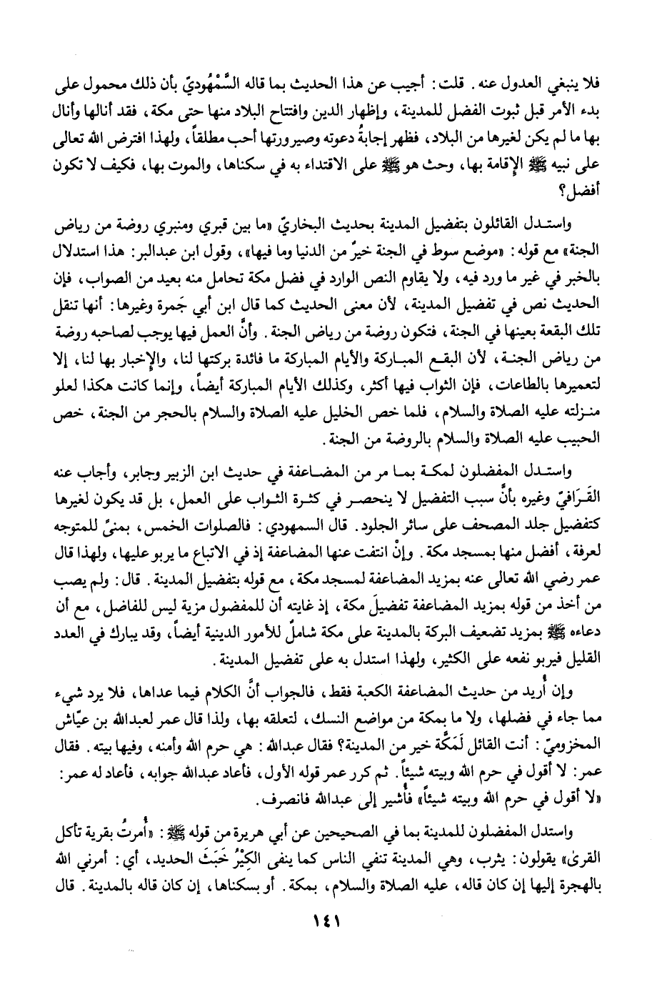 واستدل المفضلون لمكة بما مرّ من المضاعفة في حديث ابن الزبير وجابر، وأجاب عنه القَرَافيّ وغيره بأنَّ سبب التفضيل لا ينحصر في كثرة الثواب على العمل، بل قد يكون لغيرها كتفضيل جلد المصحف على سائر الجلود. قال السمهودي: فالصلوات الخمس، بمنىً للمتوجه لعرفة، أفضل منها بمسجد مكة. وإنْ انتفت عنها المضاعفة إذ في الاتباع ما يربو عليها، ولهذا قال عمر رضي الله تعالى عنه بمزيد المضاعفة لمسجد مكة، مع قوله بتفضيل المدينة. قال: ولم يصب من أخذ من قوله بمزيد المضاعفة تفضيلَ مكة، إذ غايته أن للمفضول مزية ليس للفاضل، مع أن دعاءه -صلى الله عليه وسلم- بمزيد تضعيف البركة بالمدينة على مكة شاملٌ للأمور الدينية أيضًا، وقد يبارك في العدد القليل فيربو نفعه على الكثير، ولهذا استدل به على تفضيل المدينة.