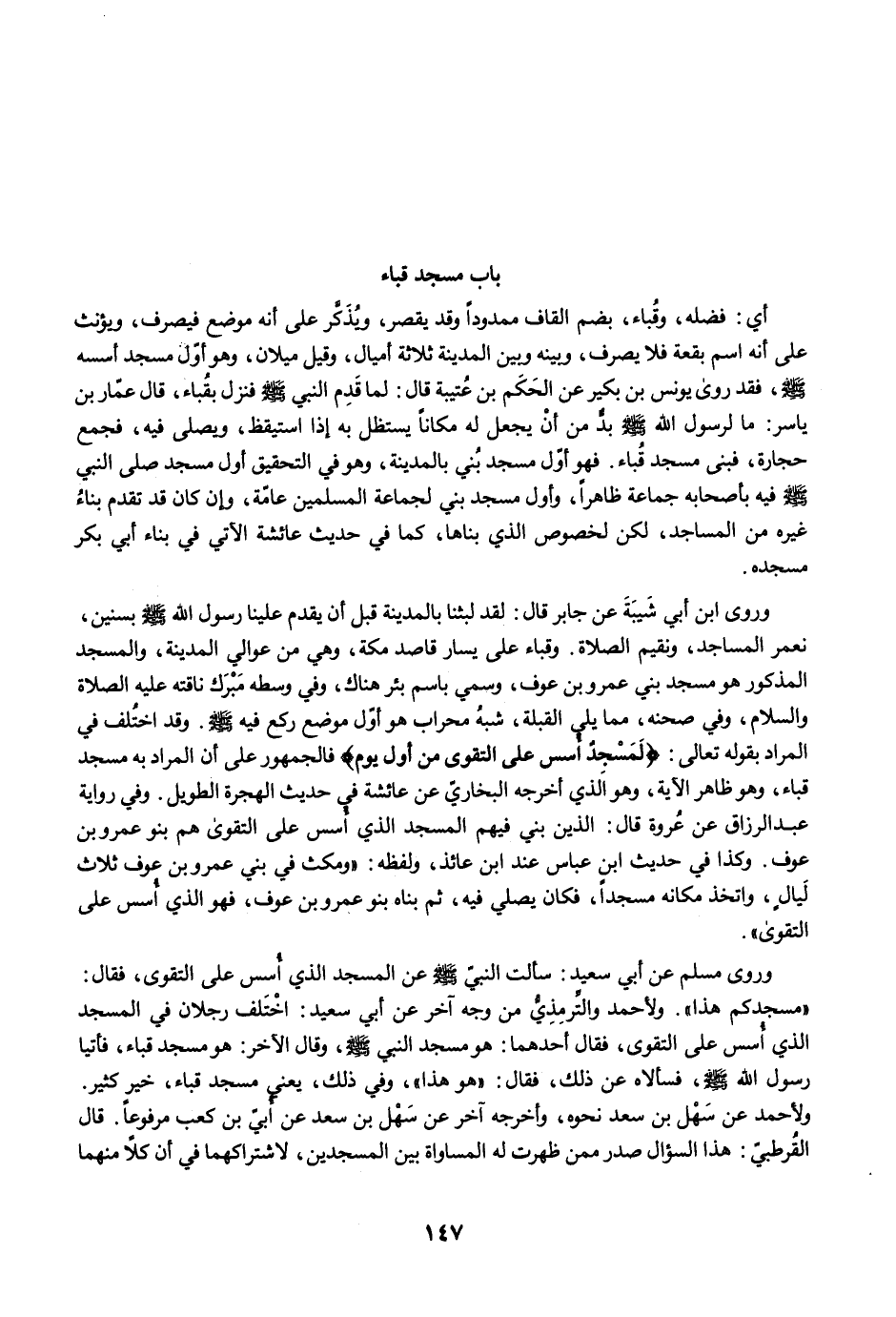 وروى ابن أبي شَيبَةَ عن جابر قال: لقد لبثنا بالمدينة قبل أن يقدم علينا رسول الله -صلى الله عليه وسلم- بسنين، نعمر المساجد، ونقيم الصلاة. وقباء على يسار قاصد مكة، وهي من عوالي المدينة، والمسجد المذكور هو مسجد بني عمرو بن عوف، وسمي باسم بئر هناك، وفي وسطه مَبْرَك ناقته عليه الصلاة والسلام، وفي صحته، مما يلي القبلة، شبهُ محراب هو أوّل موضع ركع فيه -صلى الله عليه وسلم-. وقد اختُلف في المراد بقوله تعالى: {لَمَسْجِدٌ أُسِّسَ عَلَى التَّقْوَى مِنْ أَوَّلِ يَوْمٍ} فالجمهور على أن المراد به مسجد قباء، وهو ظاهر الآية، وهو الذي أخرجه البخاريّ عن عائشة في حديث الهجرة الطويل. وفي رواية عبد الرزاق عن عُروة قال: الذين بني فيهم المسجد الذي أُسس على التقوى هم بنو عمرو بن عوف. وكذا في حديث ابن عباس عند ابن عائذ، ولفظه: "ومكث في بني عمرو بن عوف ثلاث لَيالٍ، واتخذ مكانه مسجدًا، فكان يصلي فيه، ثم بناه بنو عمرو بن عوف، فهو الذي أُسس على التقوى".