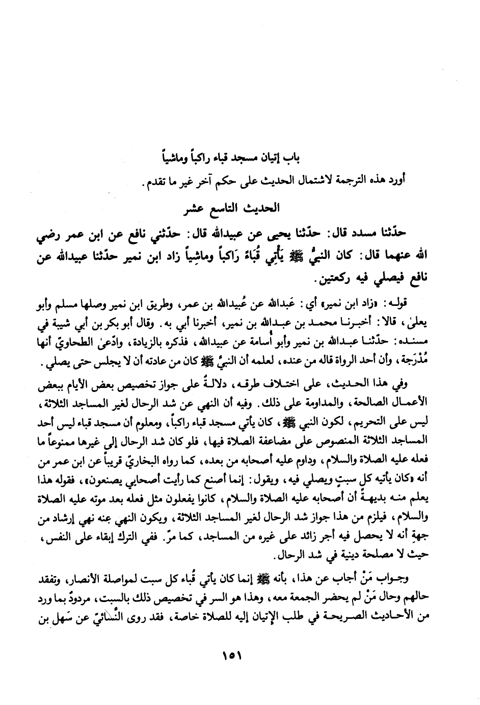 حَدَّثَنَا مُسَدَّدٌ قَالَ: حَدَّثَنَا يَحْيَى عَنْ عُبَيْدِ اللَّهِ قَالَ: حَدَّثَنِي نَافِعٌ عَنِ ابْنِ عُمَرَ رضي الله عنهما قَالَ: كَانَ النَّبِيُّ -صلى الله عليه وسلم- يَأْتِي قُبَاءً رَاكِبًا وَمَاشِيًا. زَادَ ابْنُ نُمَيْرٍ حَدَّثَنَا عُبَيْدُ اللَّهِ عَنْ نَافِعٍ فَيُصَلِّي فِيهِ رَكْعَتَيْنِ.