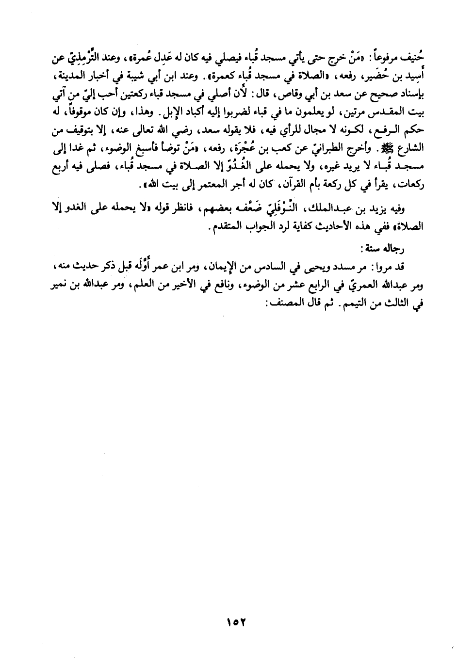 حُنيف مرفوعًا: "مَنْ خرج حتى يأتي مسجد قُباء فيصلي فيه كان له عَدِل عُمرة"، وعند التِّرْمِذِيّ عن أَسِيد بن حُضَير، رفعه، "الصلاة في مسجد قُباء كعمرة". وعند ابن أبي شيبة في أخبار المدينة، بإسناد صحيح عن سعد بن أبي وقاص، قال: لأَن أصلي في مسجد قباء ركعتين أحب إليّ من آتي بيت المقدس مرتين، لو يعلمون ما في قباء لضربوا إليه أكباد الإِبل. وهذا، وإن كان موقوفًا، له حكم الرفع، لكونه لا مجال للرأي فيه، فلا يقوله سعد، رضي الله تعالى عنه، إلا بتوقيف من الشارع -صلى الله عليه وسلم-. وأخرج الطبرانيّ عن كعب بن عُجْرَة، رفعه، "مَنْ توضأ فأسبغ الوضوء، ثم غدا إلى مسجد قُباء لا يريد غيره، ولا يحمله على الغُدُوّ إلا الصلاة في مسجد قُباء، فصلى فيه أربع ركعات، يقرأ في كل ركعة بأم القرآن، كان له أجر المعتمر إلى بيت الله".
