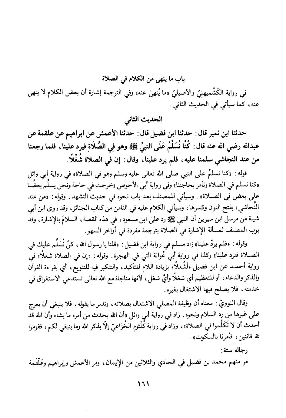 حَدَّثَنَا ابْنُ نُمَيْرٍ قَالَ: حَدَّثَنَا ابْنُ فُضَيْلٍ قَالَ: حَدَّثَنَا الأَعْمَشُ عَنْ إِبْرَاهِيمَ عَنْ عَلْقَمَةَ عَنْ عَبْدِ اللَّهِ رضي الله عنه قَالَ: كُنَّا نُسَلِّمُ عَلَى النَّبِيِّ -صلى الله عليه وسلم- وَهُوَ فِي الصَّلاَةِ فَيَرُدُّ عَلَيْنَا، فَلَمَّا رَجَعْنَا مِنْ عِنْدِ النَّجَاشِيِّ سَلَّمْنَا عَلَيْهِ فَلَمْ يَرُدَّ عَلَيْنَا وَقَالَ: إِنَّ فِي الصَّلاَةِ شُغْلاً.
