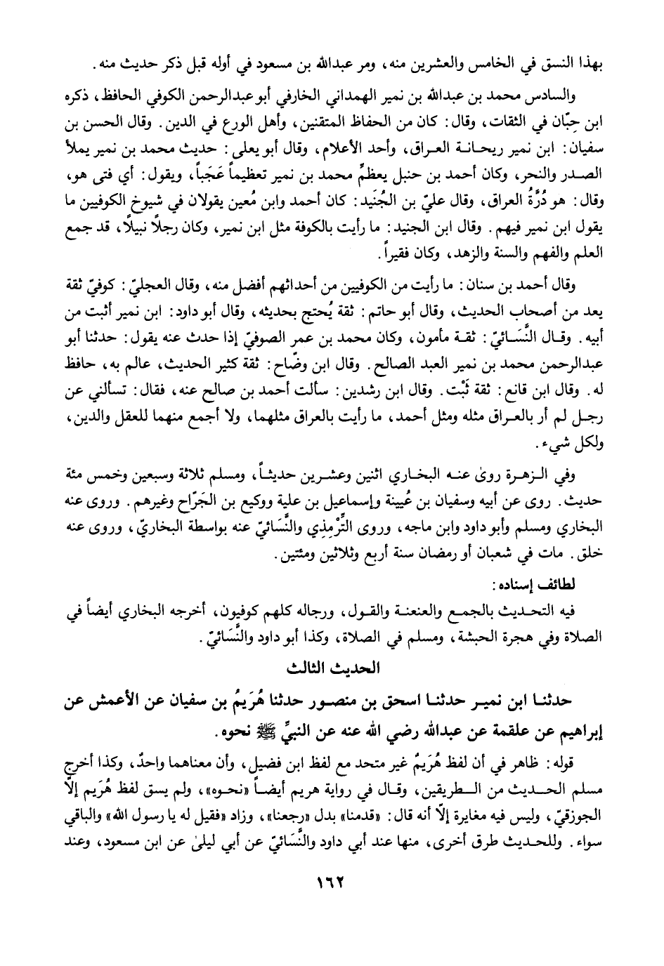 والسادس محمد بن عبد الله بن نمير الهمداني الخارفي أبو عبد الرحمن الكوفي الحافظ، ذكره ابن حِبّان في الثقات، وقال: كان من الحفاظ المتقنين، وأهل الورع في الدين. وقال الحسن بن سفيان: ابن نمير ريحانة العراق، وأحد الأعلام، وقال أبو يعلى: حديث محمد بن نمير يملأ الصدر والنحر، وكان أحمد بن حنبل يعظم محمد بن نمير تعظيمًا عَجَبًا، ويقول: أي فتى هو، وقال: هو دُرَّةُ العراق، وقال عليّ بن الجُنَيد: كان أحمد وابن مُعين يقولان في شيوخ الكوفيين ما يقول ابن نمير فيهم. وقال ابن الجنيد: ما رأيت بالكوفة مثل ابن نمير، وكان رجلًا نبيلاً، قد جمع العلم والفهم والسنة والزهد، وكان فقيرًا.