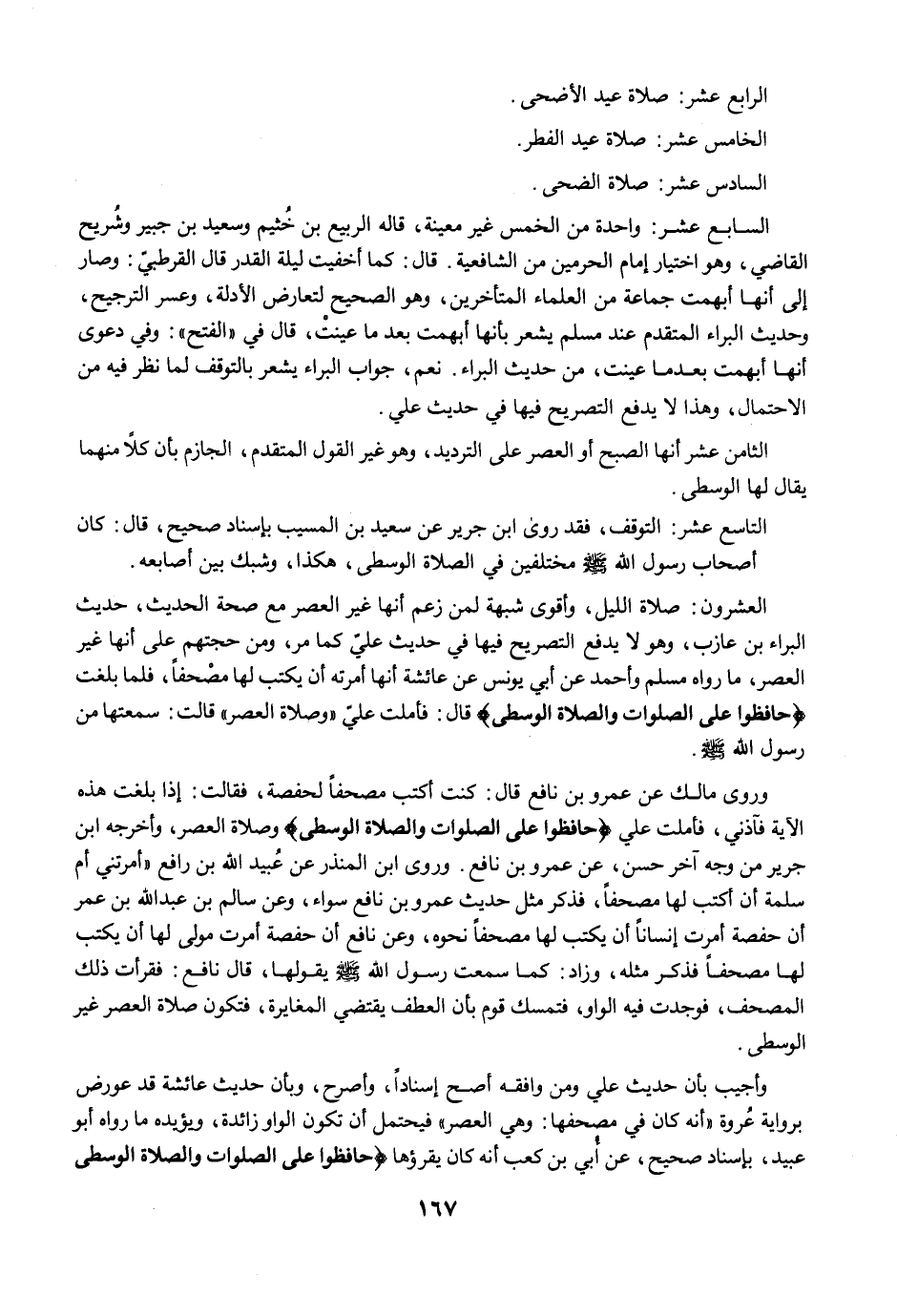 العشرون: صلاة الليل، وأقوى شبهة لمن زعم أنها غير العصر مع صحة الحديث، حديث البراء بن عازب، وهو لا يدفع التصريح فيها في حديث عليّ كما مرّ، ومن حجتهم على أنها غير العصر، ما رواه مسلم وأحمد عن أبي يونس عن عائشة أنها أمرته أن يكتب لها مصْحفًا، فلما بلغت {حَافِظُوا عَلَى الصَّلَوَاتِ وَالصَّلَاةِ الْوُسْطَى} قال: فأملت عليّ "وصلاة العصر" قالت: سمعتها من رسول الله -صلى الله عليه وسلم-.