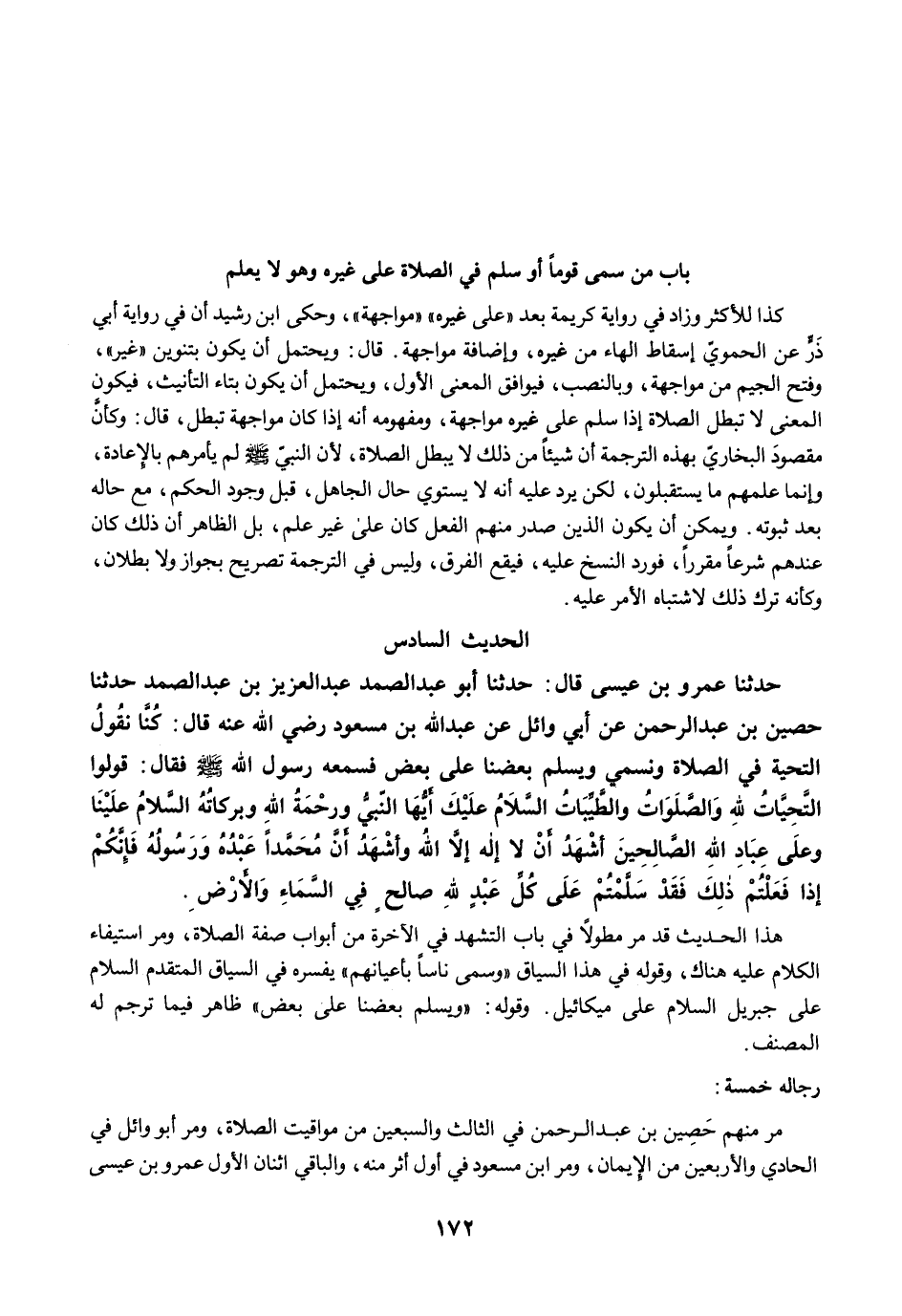 حَدَّثَنَا عَمْرُو بْنُ عِيسَى قَالَ: حَدَّثَنَا أَبُو عَبْدِ الصَّمَدِ عَبْدُ الْعَزِيزِ بْنُ عَبْدِ الصَّمَدِ حَدَّثَنَا حُصَيْنُ بْنُ عَبْدِ الرَّحْمَنِ عَنْ أَبِي وَائِلٍ عَنْ عَبْدِ اللَّهِ بْنِ مَسْعُودٍ رضي الله عنه قَالَ: كُنَّا نَقُولُ التَّحِيَّةُ فِي الصَّلاَةِ وَنُسَمِّي، وَيُسَلِّمُ بَعْضُنَا عَلَى بَعْضٍ، فَسَمِعَهُ رَسُولُ اللَّهِ -صلى الله عليه وسلم- فَقَالَ: قُولُوا التَّحِيَّاتُ لِلَّهِ وَالصَّلَوَاتُ وَالطَّيِّبَاتُ، السَّلاَمُ عَلَيْكَ أَيُّهَا النَّبِيُّ وَرَحْمَةُ اللَّهِ وَبَرَكَاتُهُ، السَّلاَمُ عَلَيْنَا وَعَلَى عِبَادِ اللَّهِ الصَّالِحِينَ، أَشْهَدُ أَنْ لاَ إِلَهَ إِلاَّ اللَّهُ وَأَشْهَدُ أَنَّ مُحَمَّدًا عَبْدُهُ وَرَسُولُهُ، فَإِنَّكُمْ إِذَا فَعَلْتُمْ ذَلِكَ فَقَدْ سَلَّمْتُمْ عَلَى كُلِّ عَبْدٍ لِلَّهِ صَالِحٍ فِي السَّمَاءِ وَالأَرْضِ.