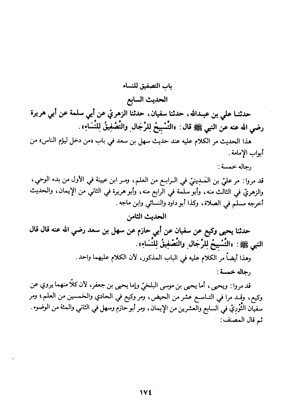 حَدَّثَنَا يَحْيَى أَخْبَرَنَا وَكِيعٌ عَنْ سُفْيَانَ عَنْ أَبِي حَازِمٍ عَنْ سَهْلِ بْنِ سَعْدٍ رضي الله عنه قَالَ قَالَ النَّبِيُّ -صلى الله عليه وسلم-: "التَّسْبِيحُ لِلرِّجَالِ وَالتَّصْفِيحُ لِلنِّسَاءِ".